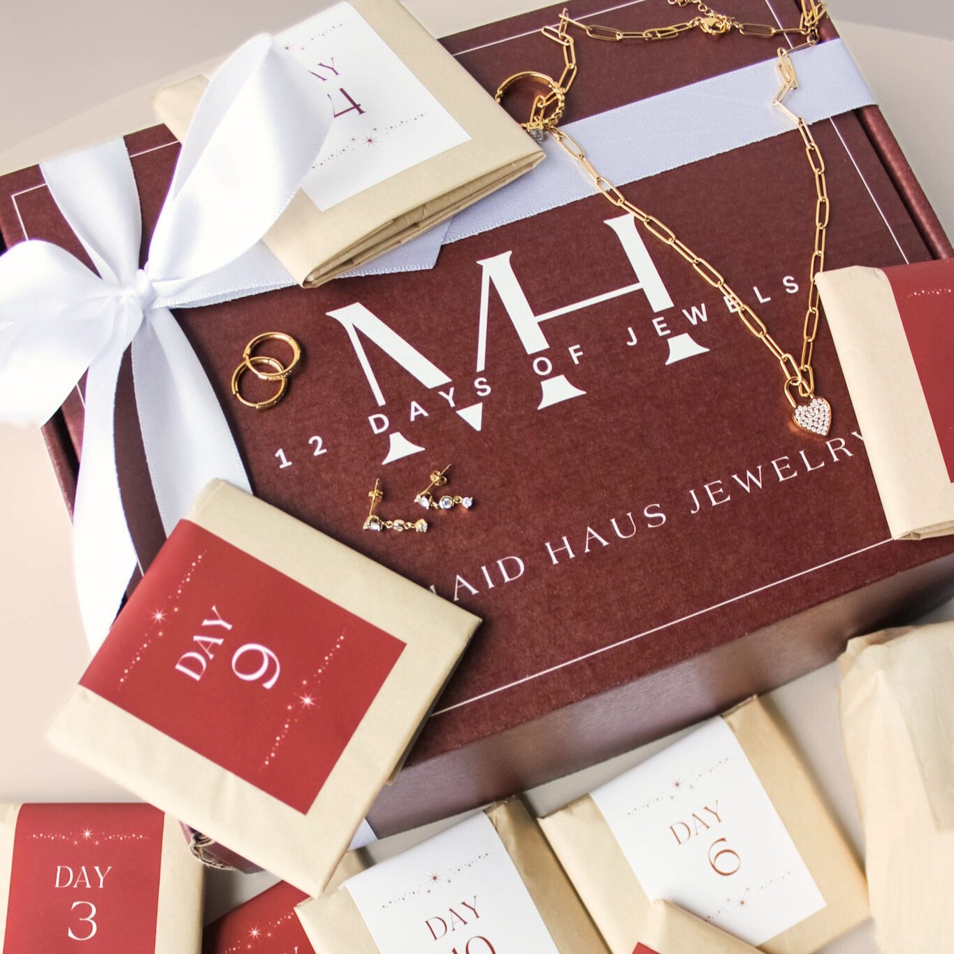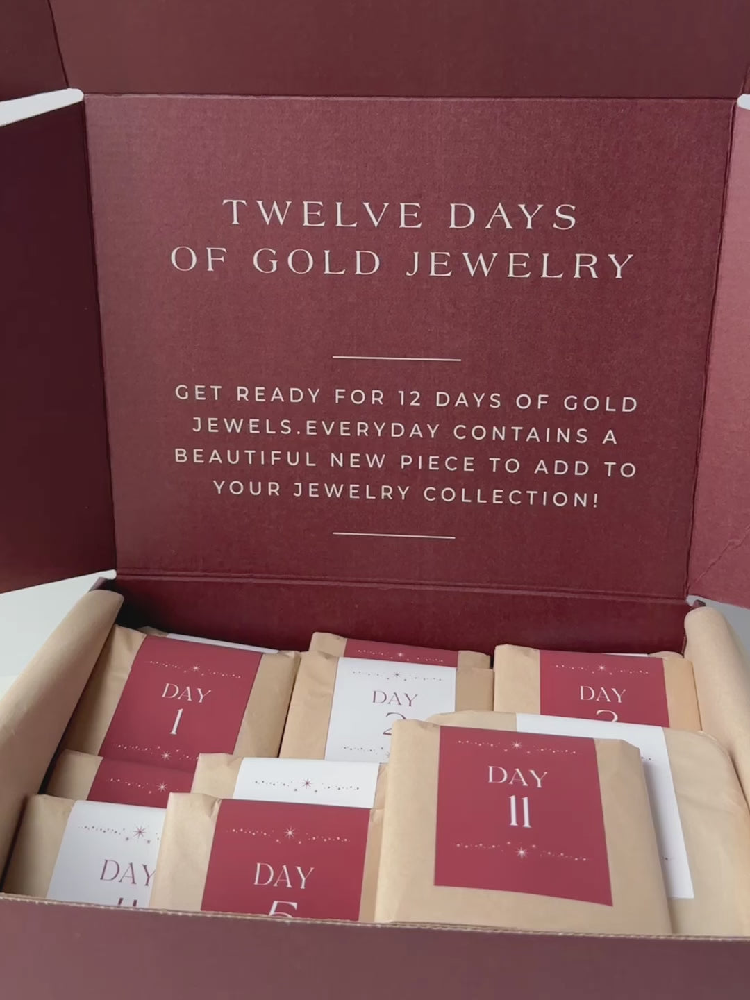 • Each box comes with 12 days of curated pieces, each day comes with a gold piece(s) in our branded jewelry pouch.