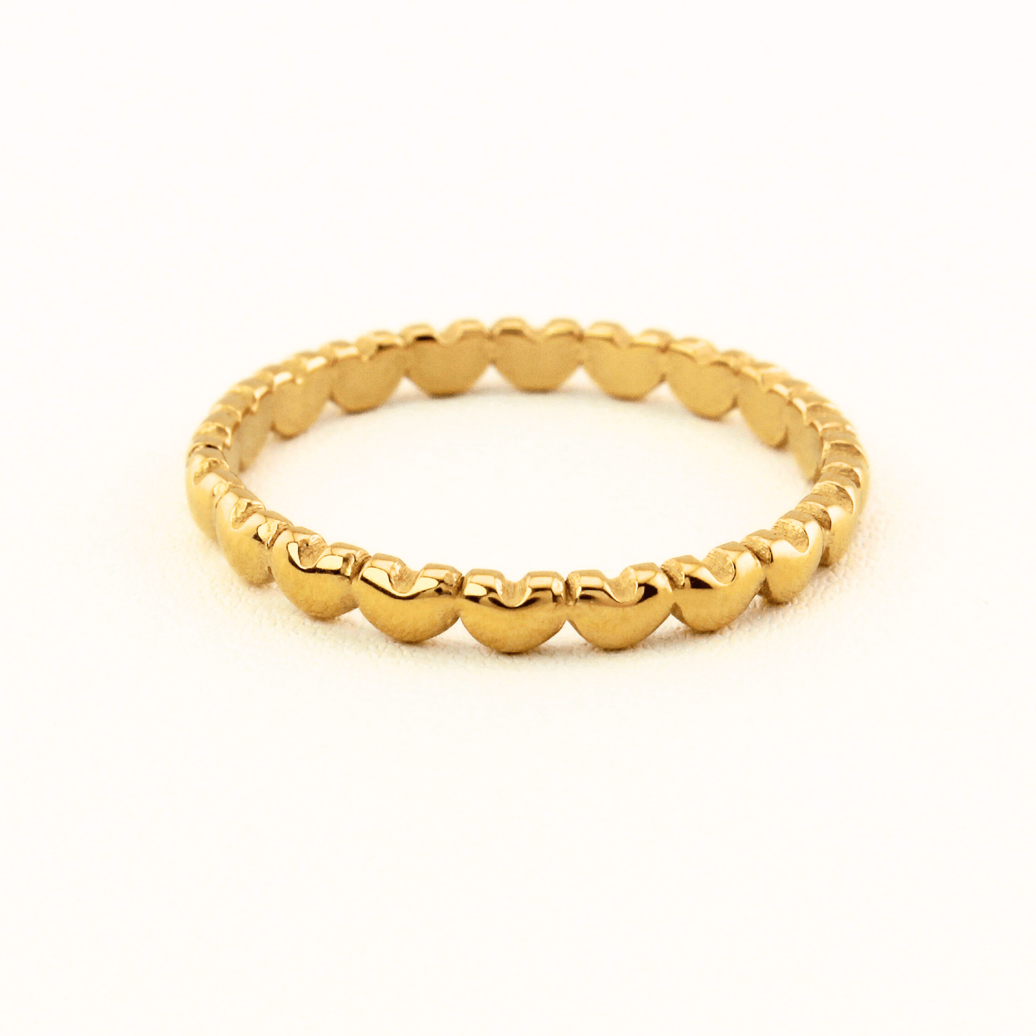 Add a touch of love to your jewelry collection with our Amour Ring. Made from gold plated stainless steel, this stackable ring features a band of mini hearts, creating a simple and elegant design. Whether worn on its own or layered with other rings, this water-safe and tarnish-resistant piece offers endless styling options.