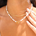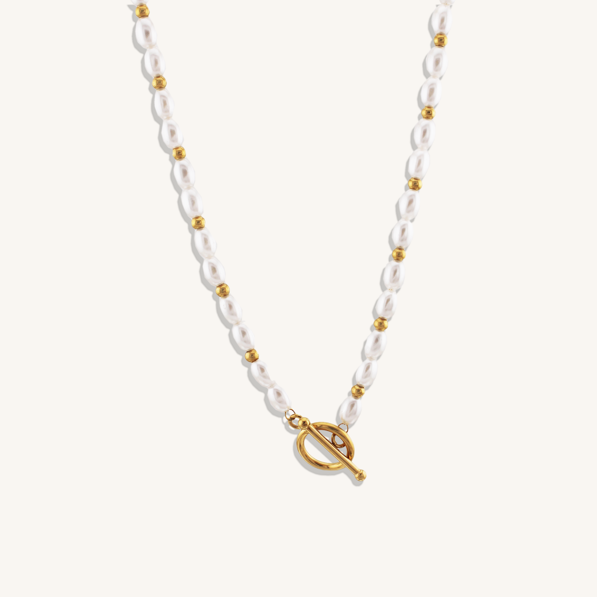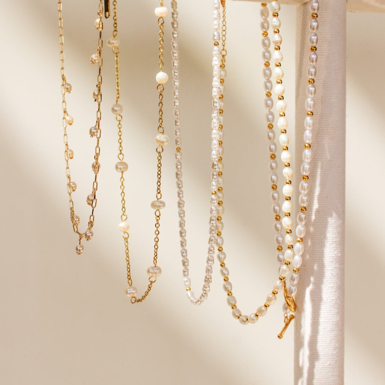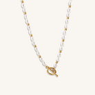 Elevate your everyday wear with the Cora Necklace, featuring a mix of faux pearls and gold beads on a sturdy gold plated stainless steel chain. The toggle clasp ensures a secure fit for all-day wear, while the durable design makes it perfect for beach jewelry. The Cora Necklace is the perfect finishing touch to any outfit.