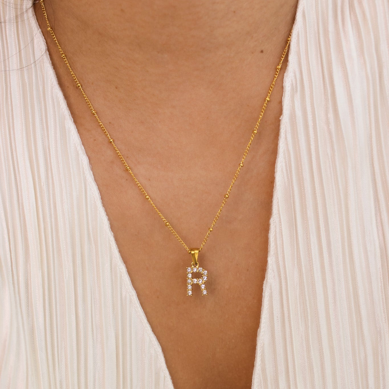 This dainty initial necklace features a fine sparkly letter initial cubic zirconia charm. Which comes in a gold cable chain or a bead satellite chain. This is perfect for an everyday necklace!