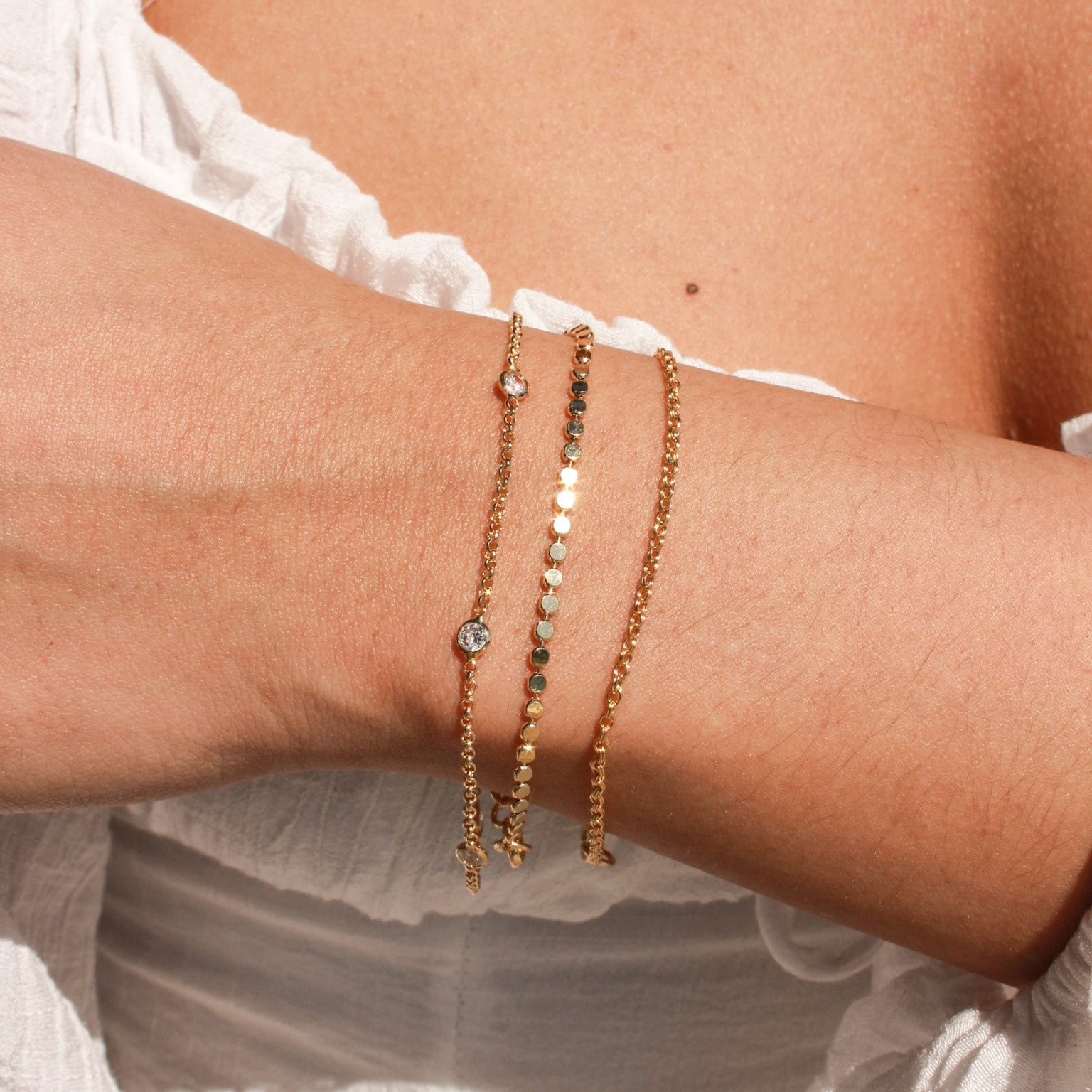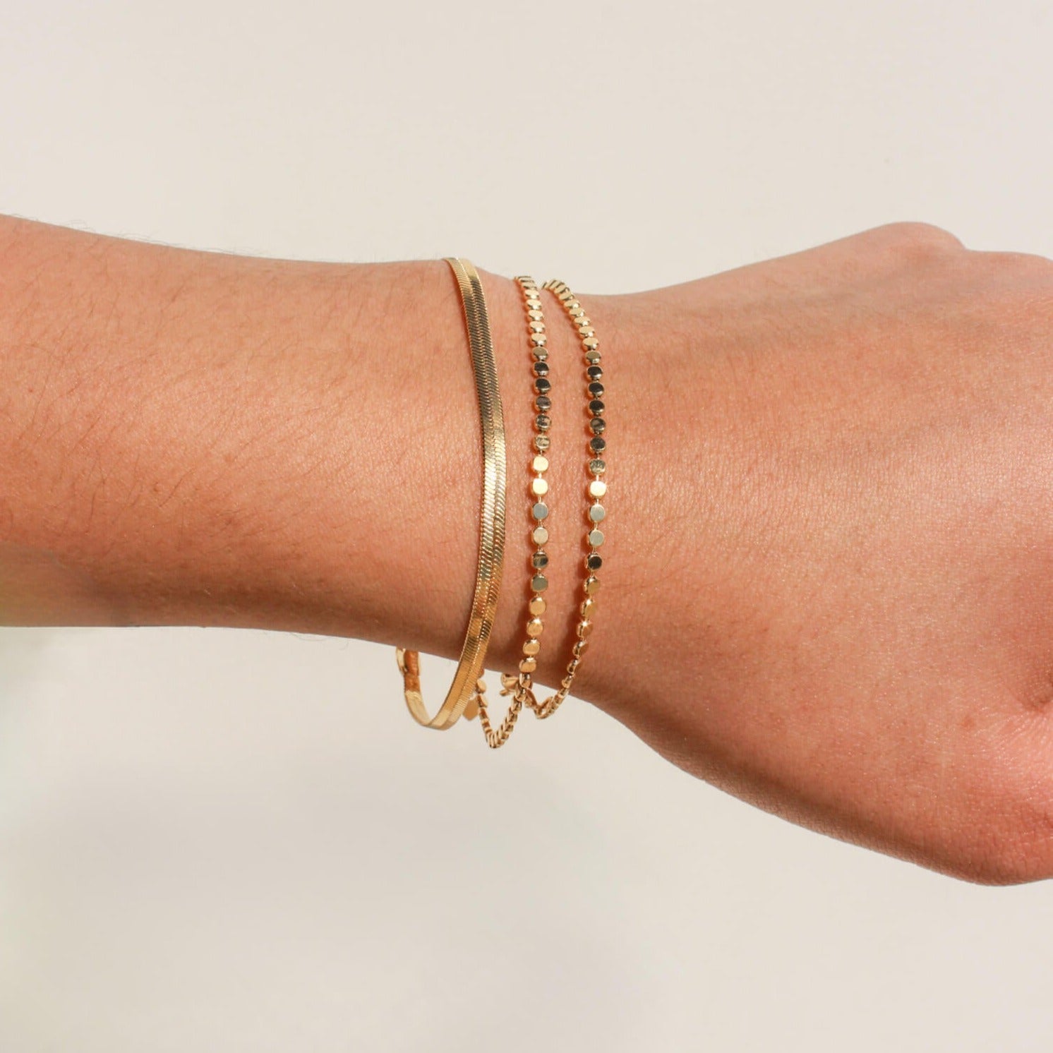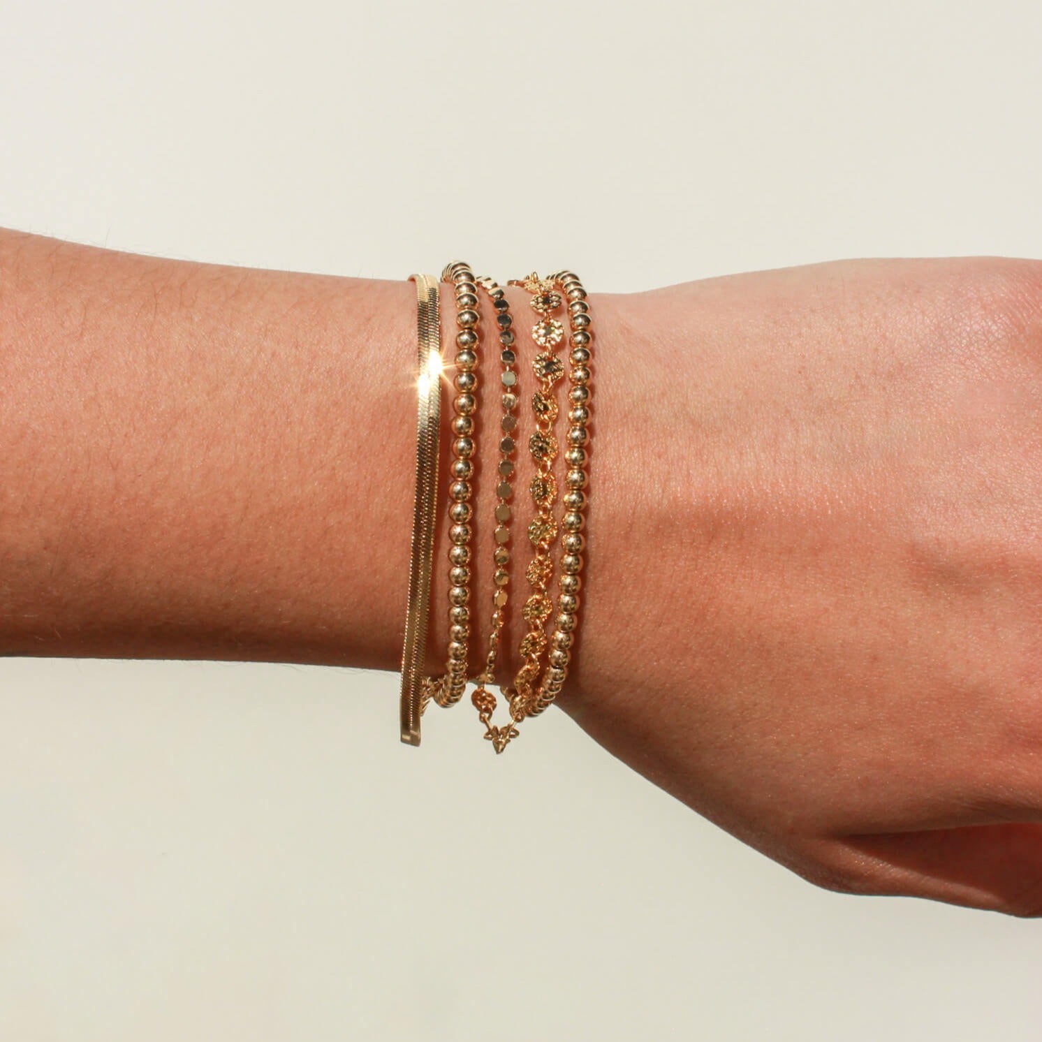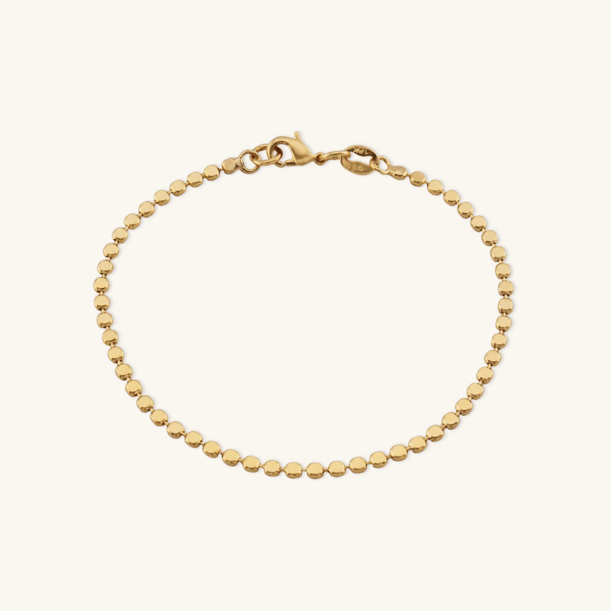 Make a statement with the minimal Francesca bracelet. This piece features a sleek flat bead design in shiny gold filled metal. The Francesca bracelet is lightweight and comfortable for all day everyday wear, plus it is tarnish resistant!
