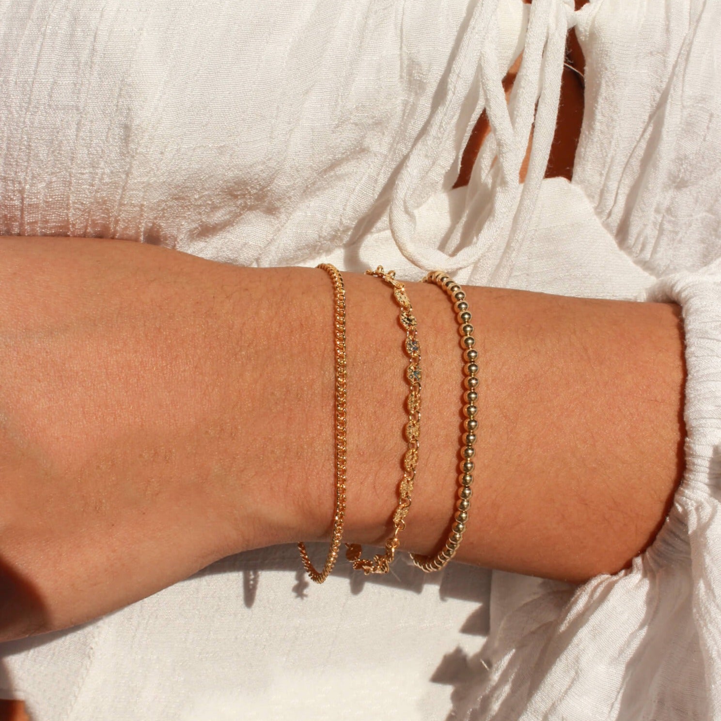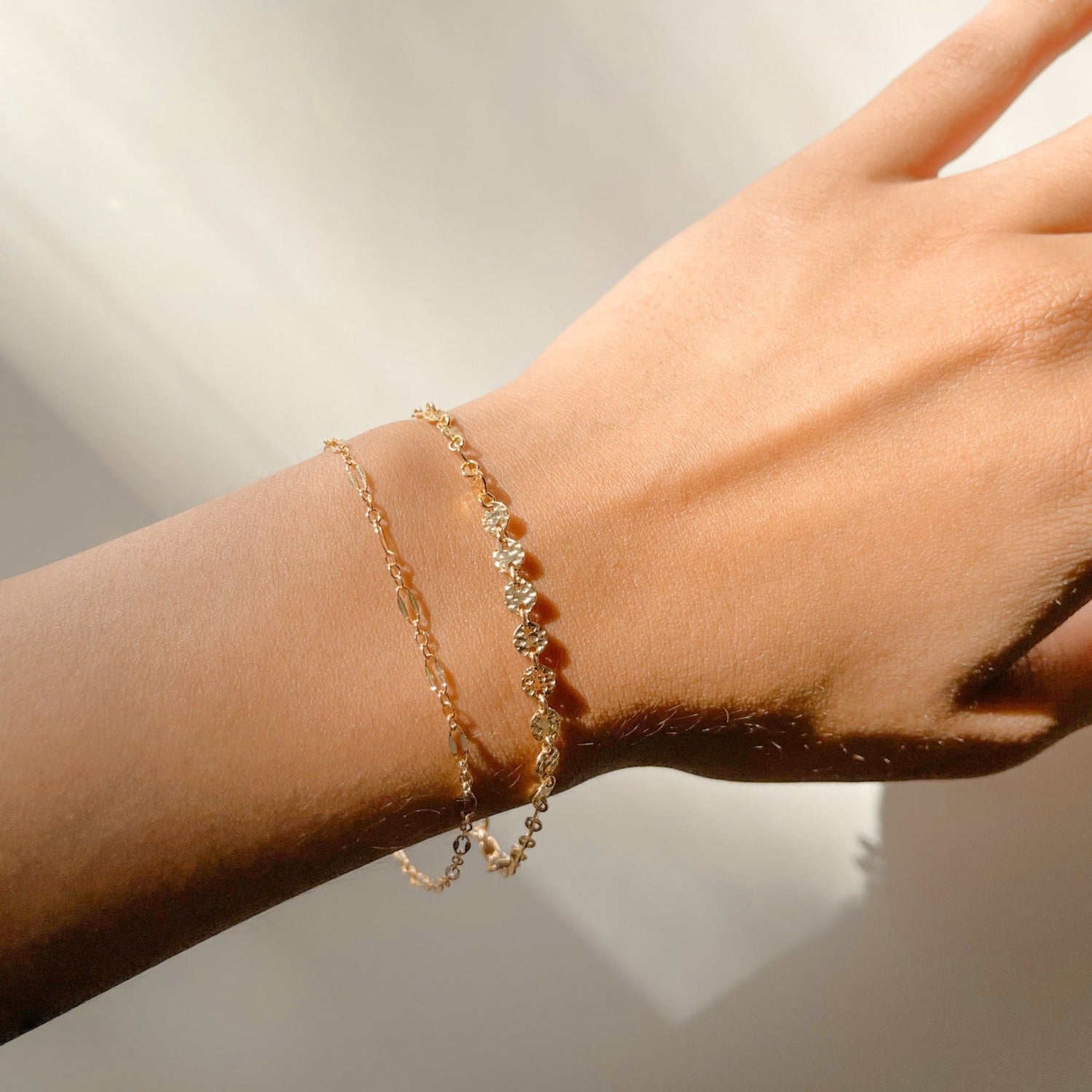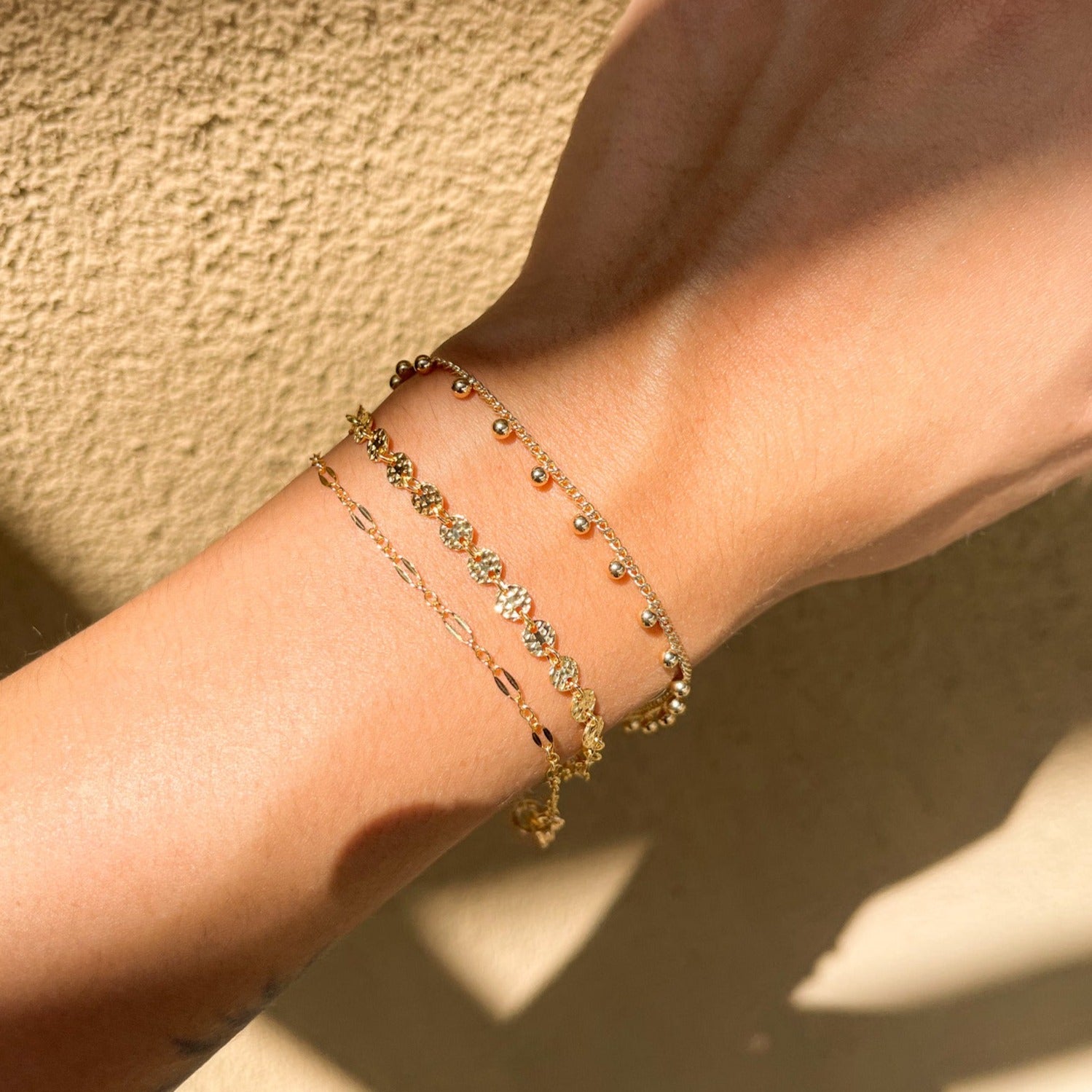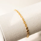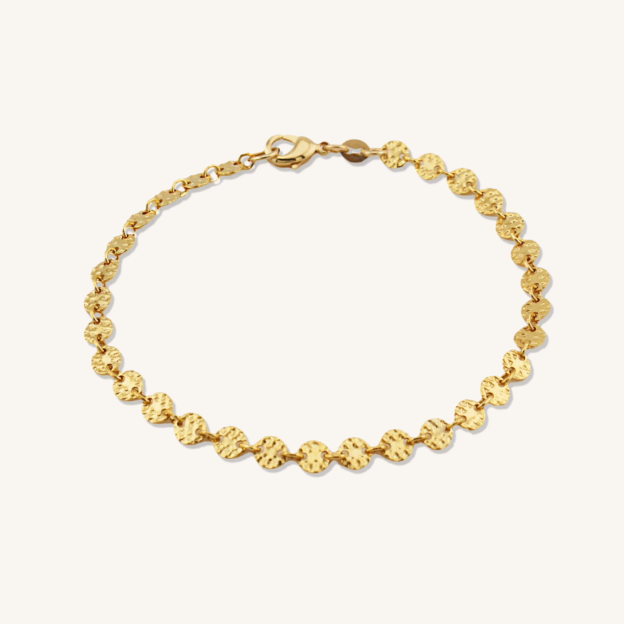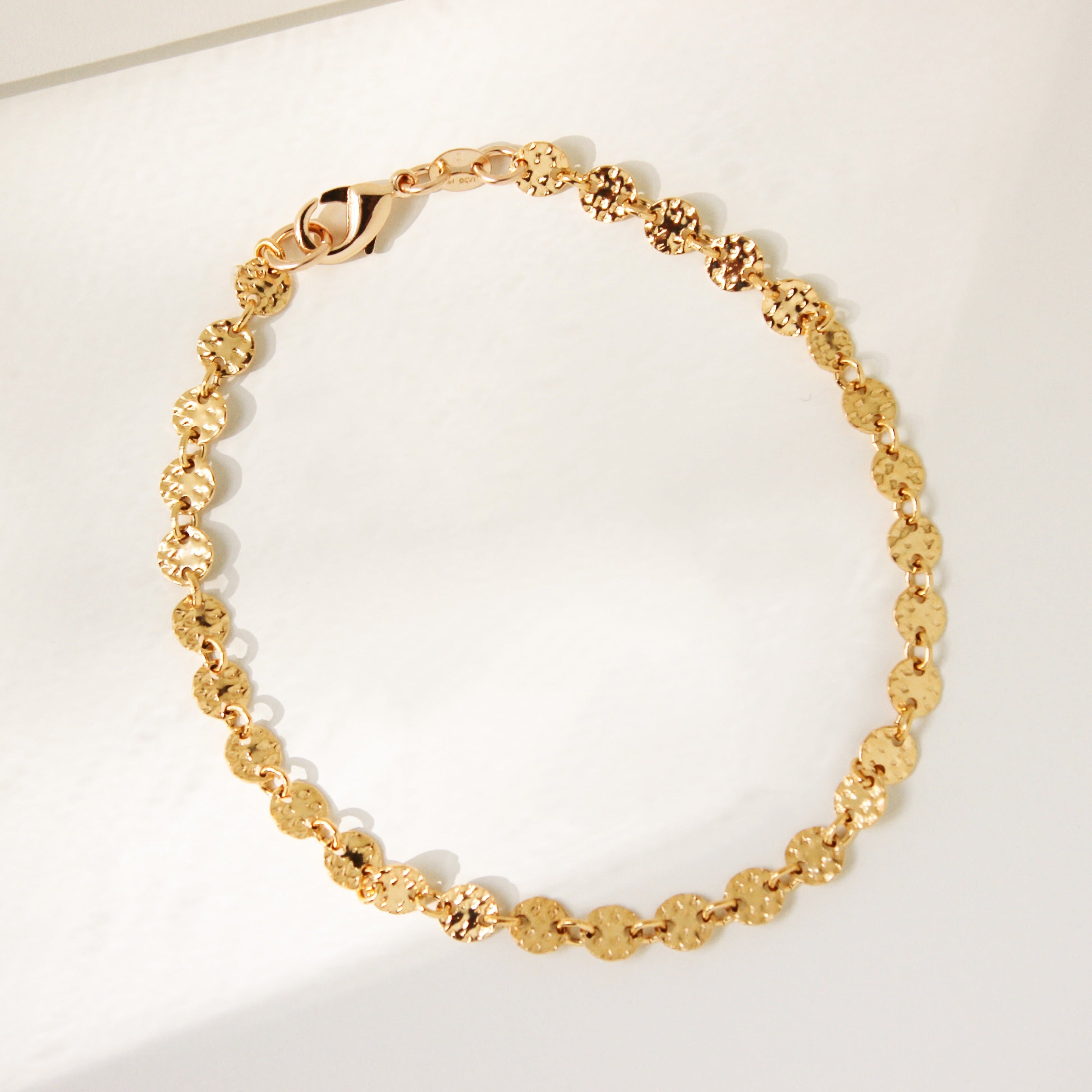 Our Lydia Bracelet is the perfect addition to any jewelry stack! Made with high-quality gold filled material, this dainty and minimal piece features a hammered disc chain that adds a unique touch of texture. Tarnish resistant and comfortable to wear everyday, you'll never want to take it off!