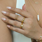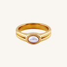 Meet our stunning Marina Ring Pearl Statement Ring! This gorgeous piece features a beautiful, luminous oval pearl nestled securely in a sleek, golden band. The band itself has these cool, subtle grooves on the sides that give it a unique and polished look!