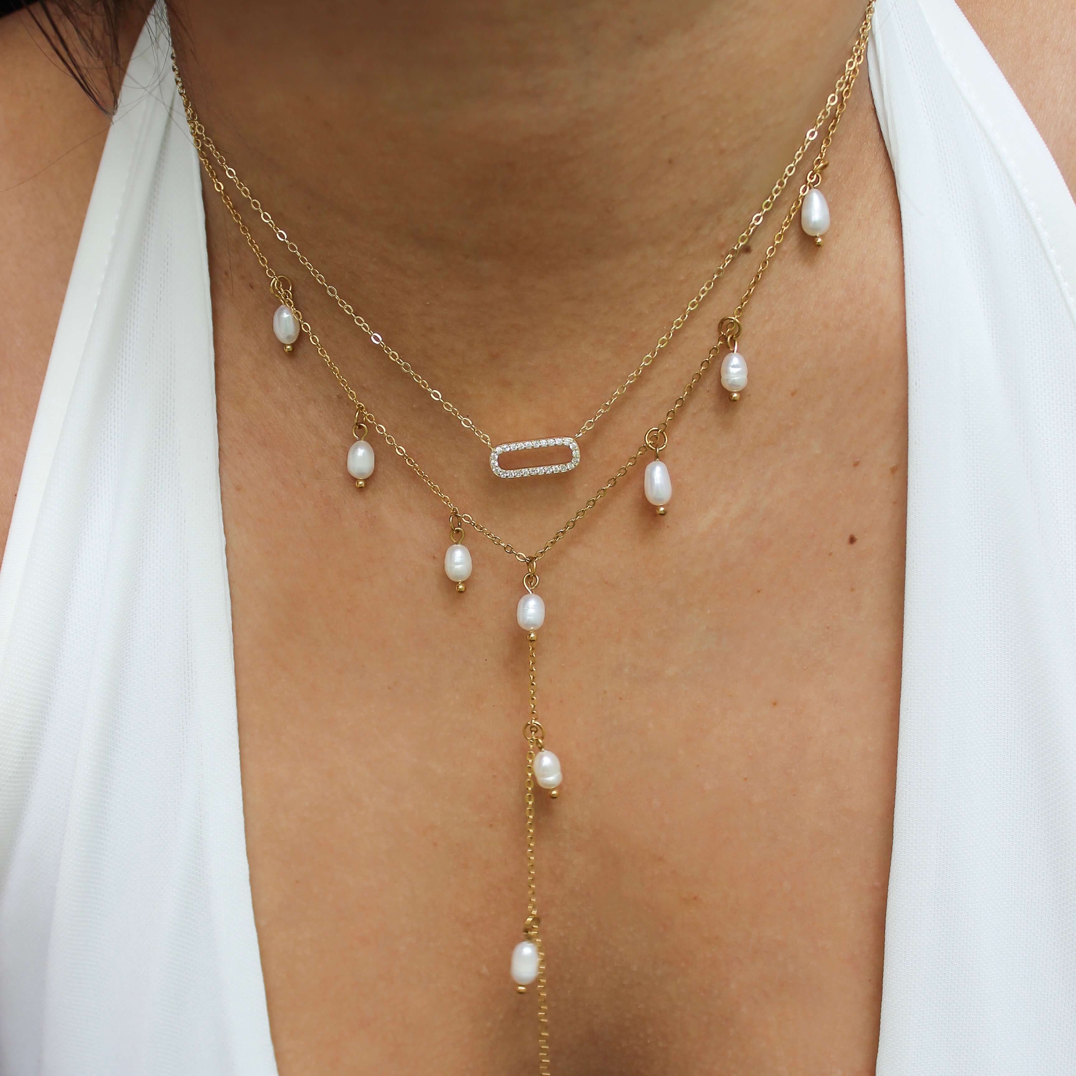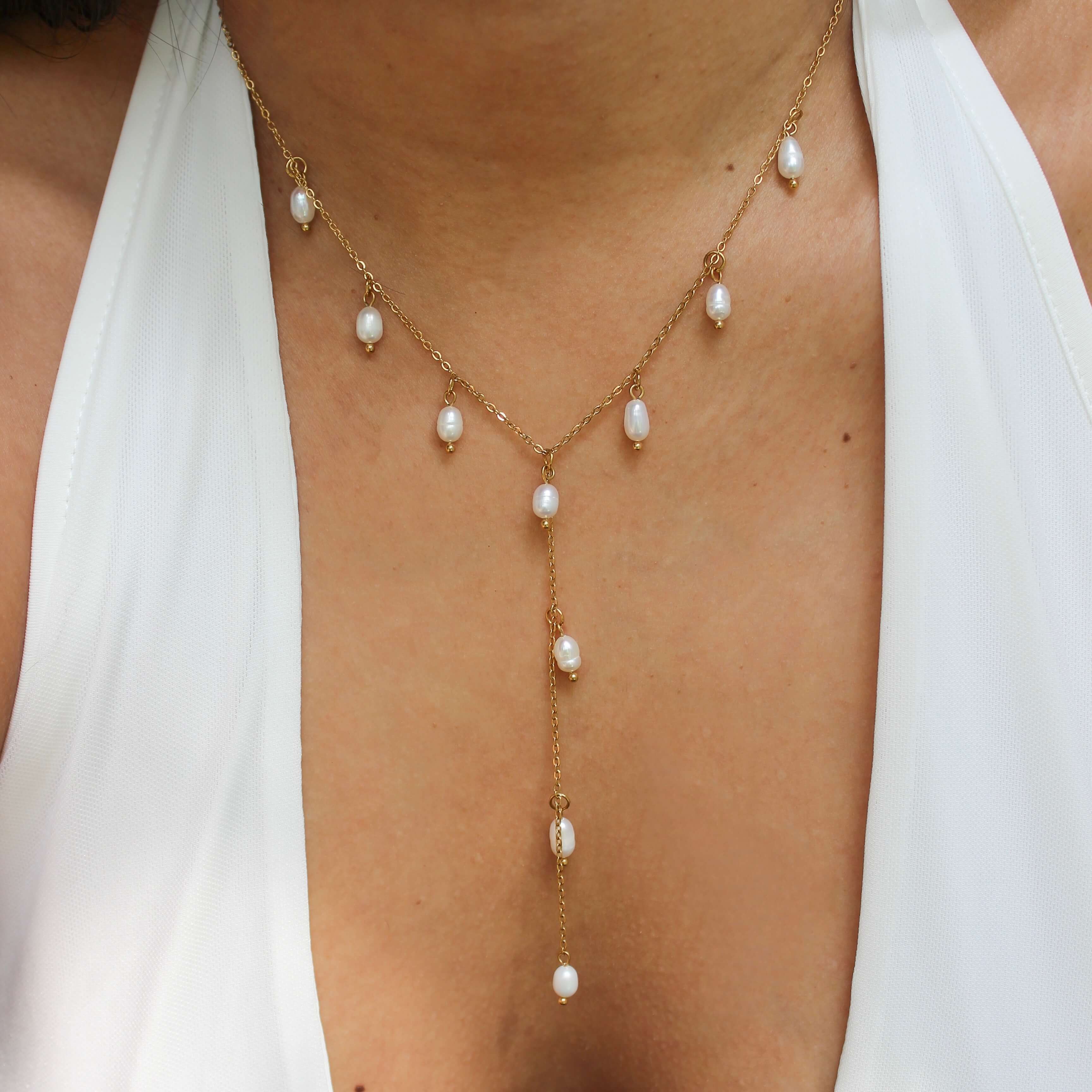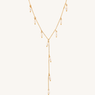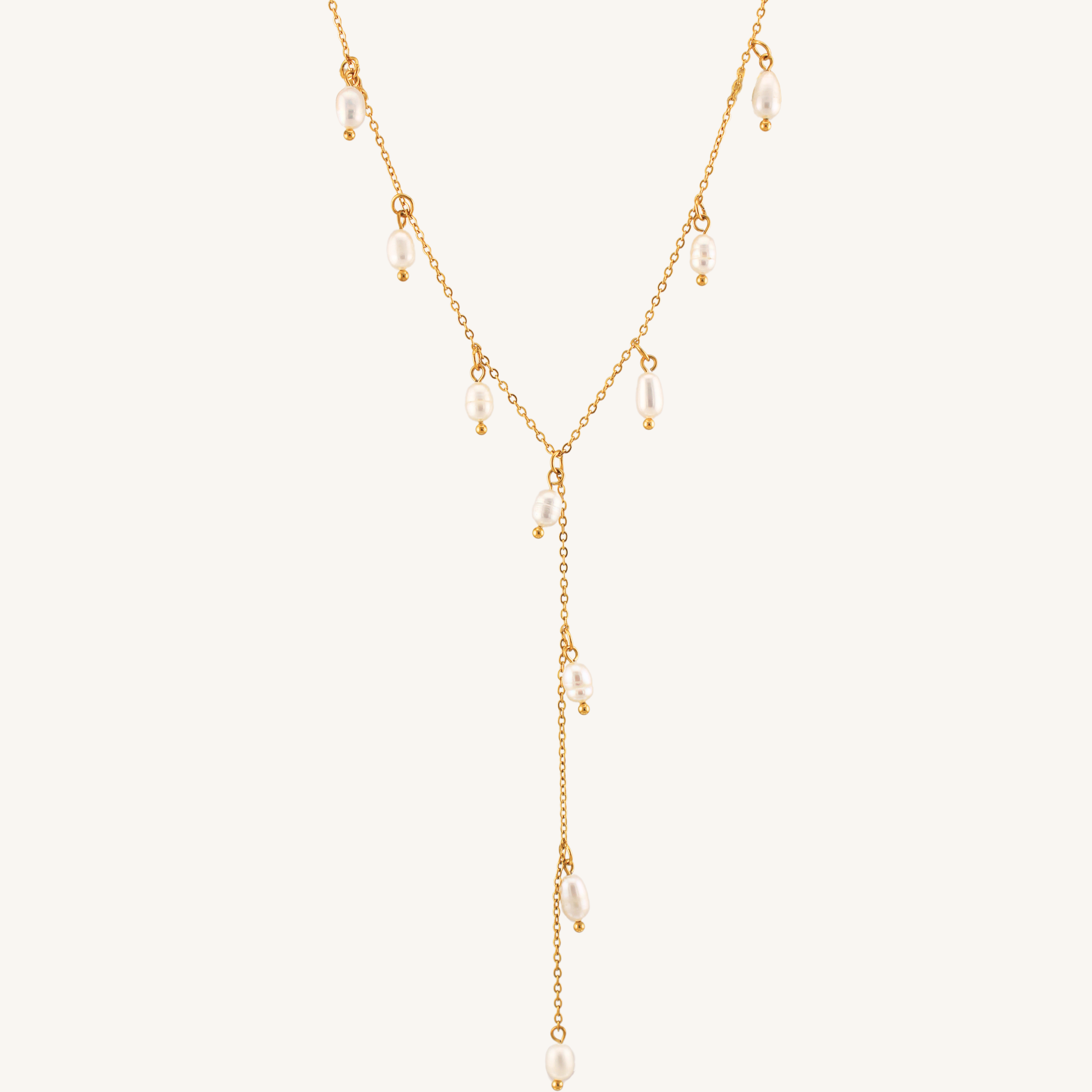 This gorgeous piece features delicate, pearls sprinkled along a fine golden chain, into a lariat design. his necklace is so versatile – it effortlessly elevates your everyday style, and absolutely shines for those special occasions!