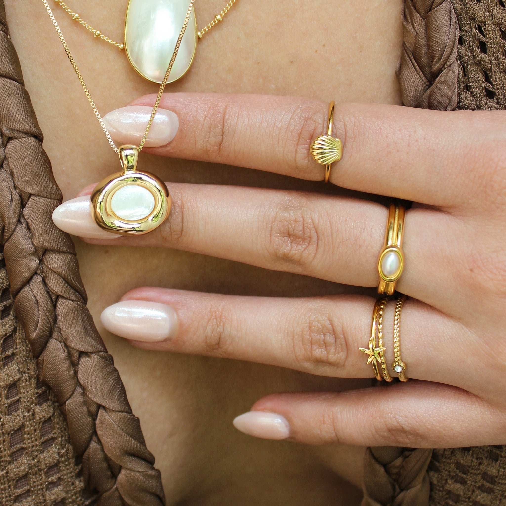 Meet our Paradise Ring Set! This isn't just one ring, it's a whole stack of summer rings, designed to be worn all together or mixed and matched however you like. You get a ring with a detailed starfish, another with a charming seashell, and a dainty double ring featuring a sparkling stone. Each one is designed to complement the others, creating a stacked look that’s pure vacation bliss.