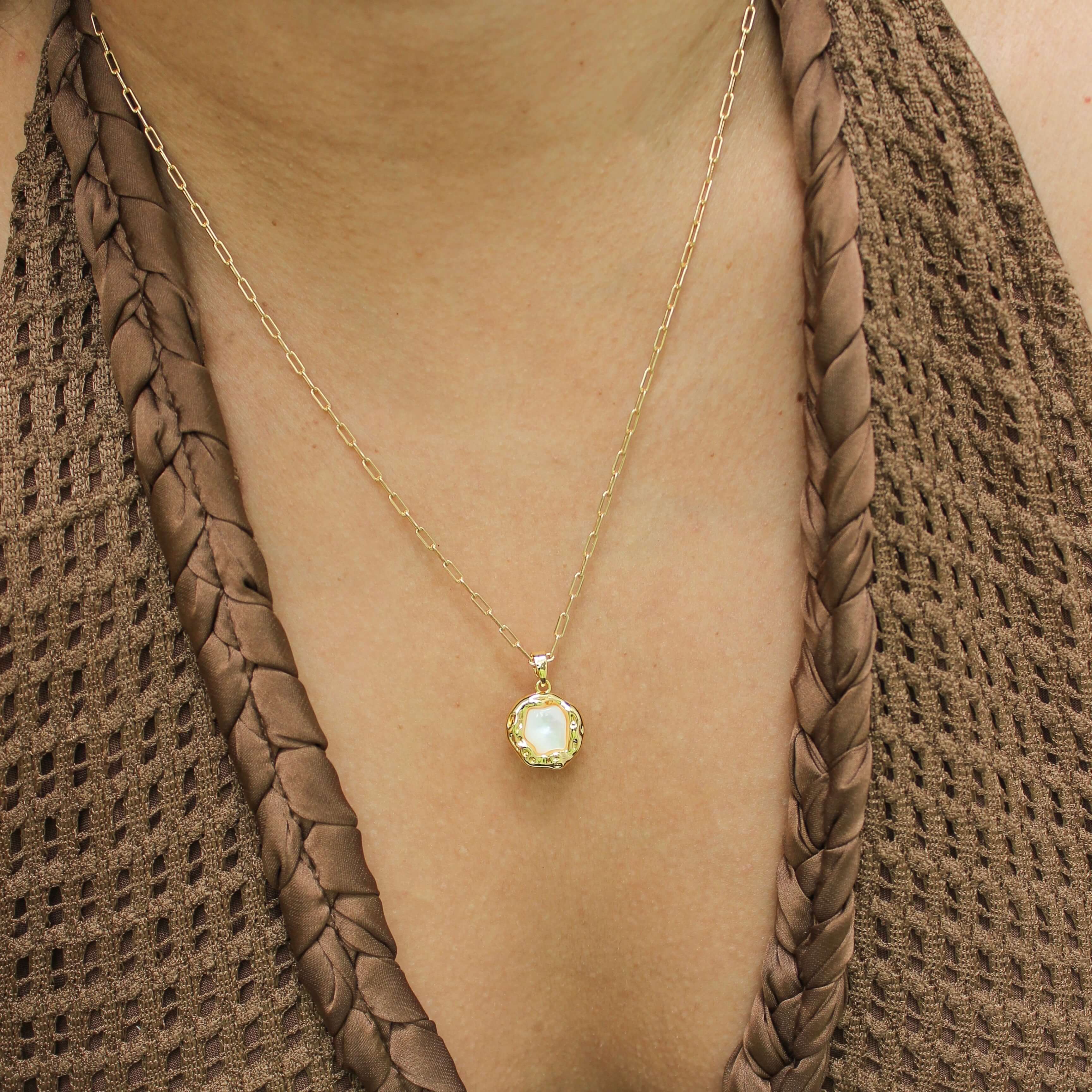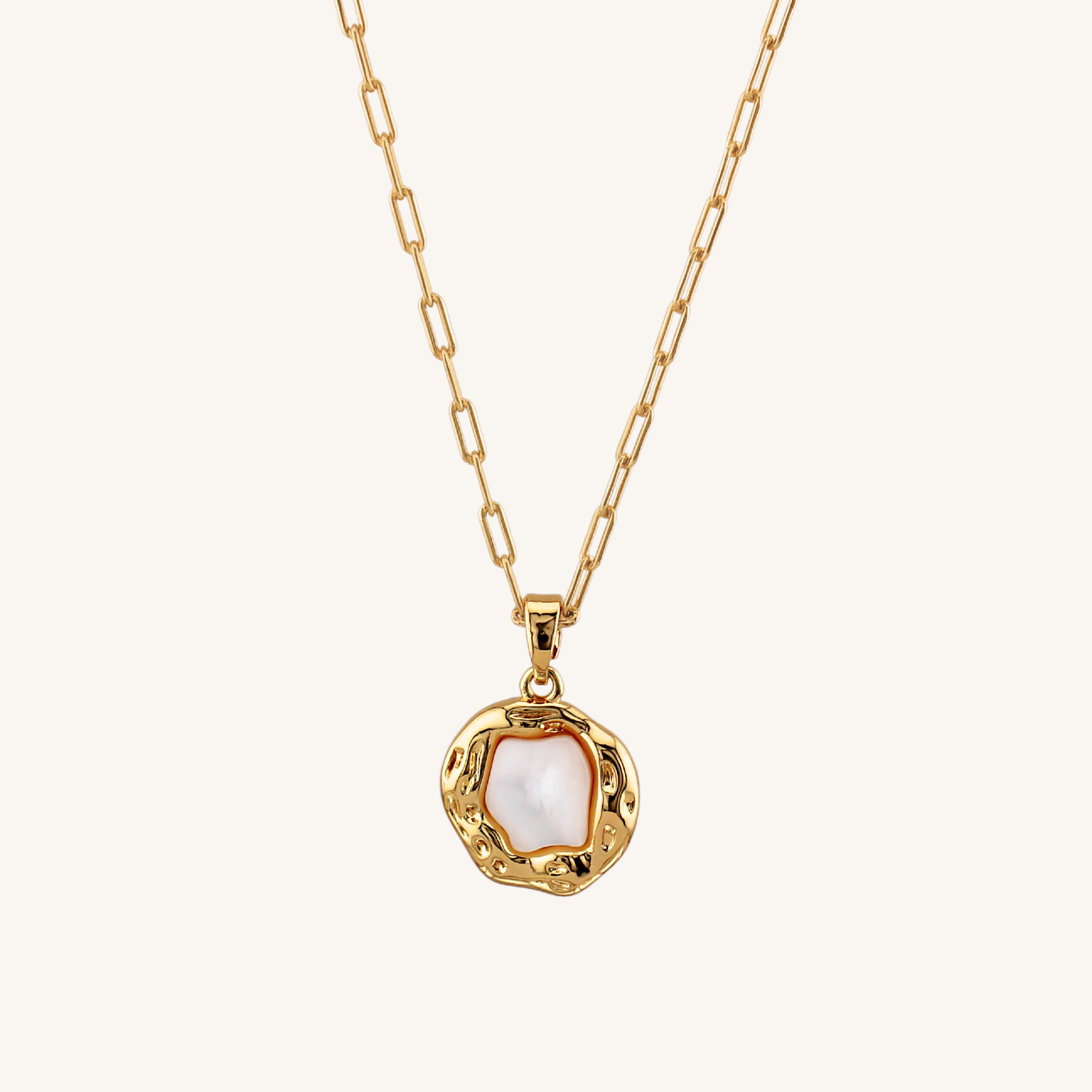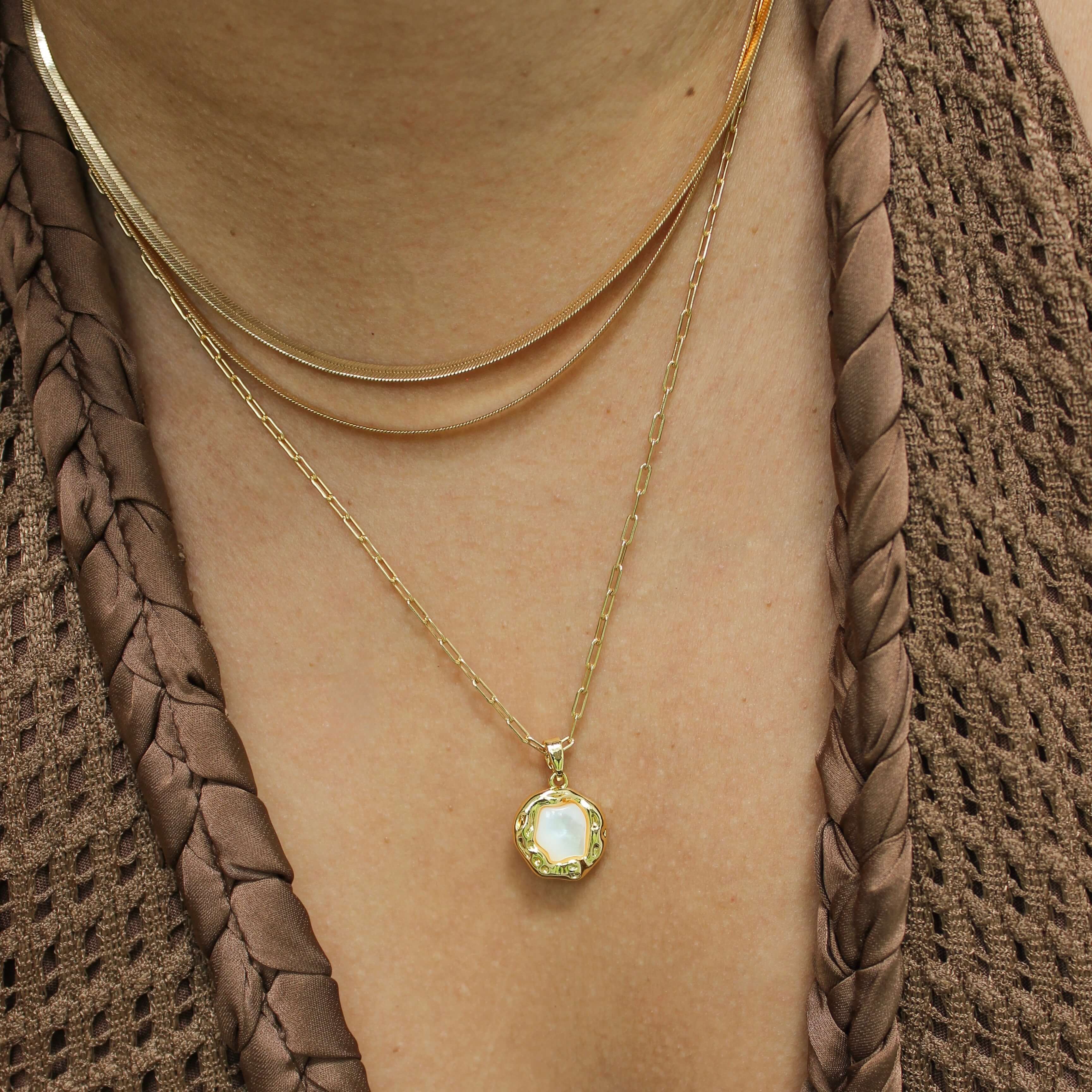 Elevate your summer style with the Sea foam necklace – a coastal-inspired statement piece crafted for golden hour and beyond. Featuring a hammered gold circle pendant and paired with a modern paperclip chain.