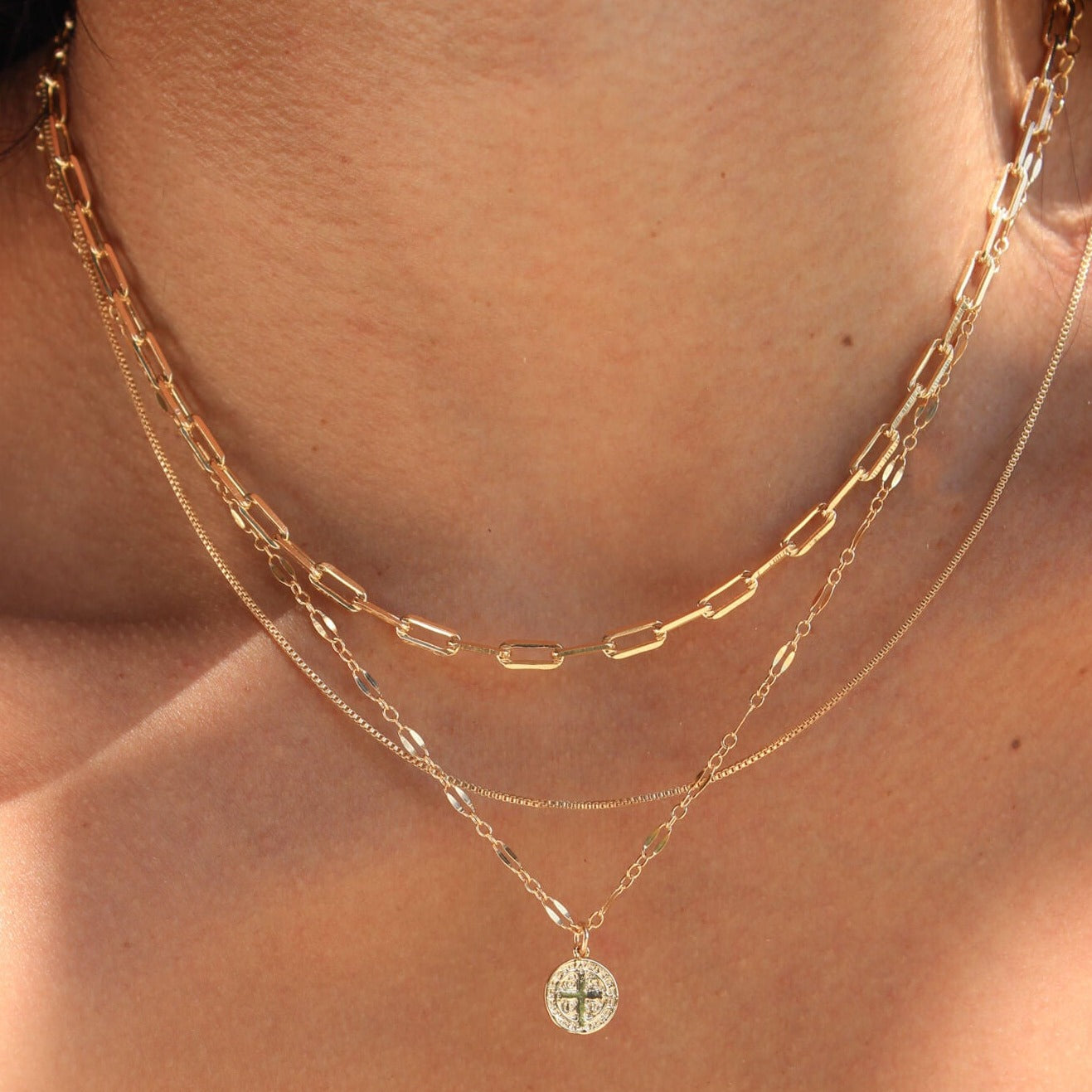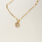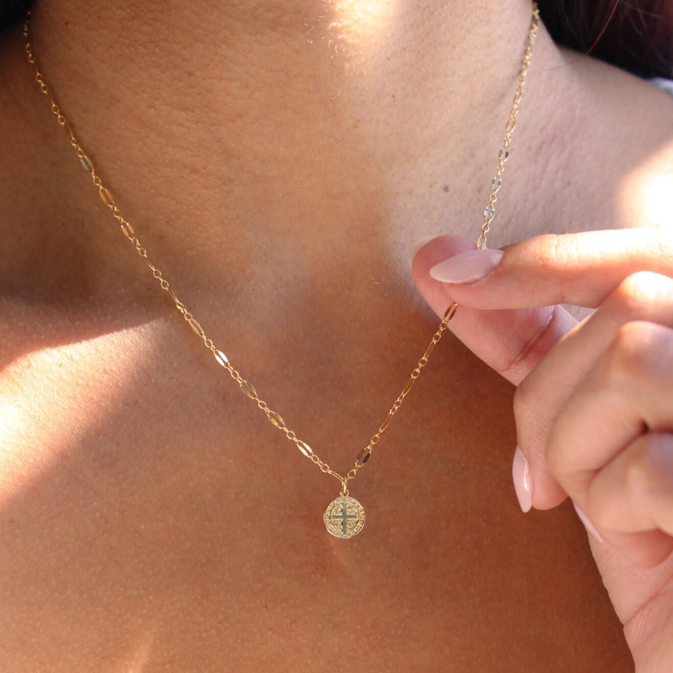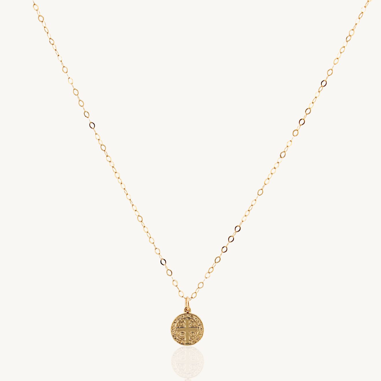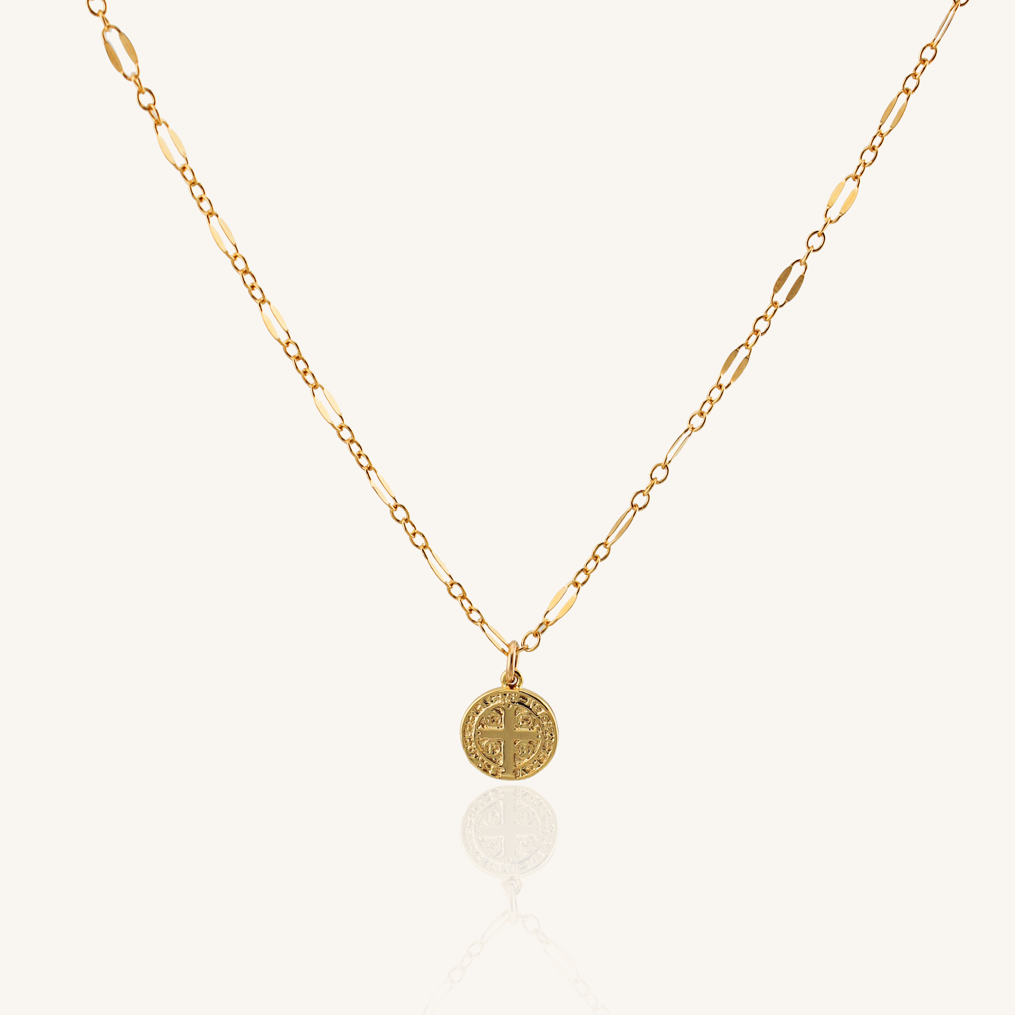 Elevate your jewelry collection with our St. Benedict Necklace. This gold filled chain necklace features a St. Benedict charm coin for a cute and dainty look. This dainty charm can be on a gold filled cable chain or a gold filled dapped figaro chain. These style chains make it perfect for layering with other necklaces!