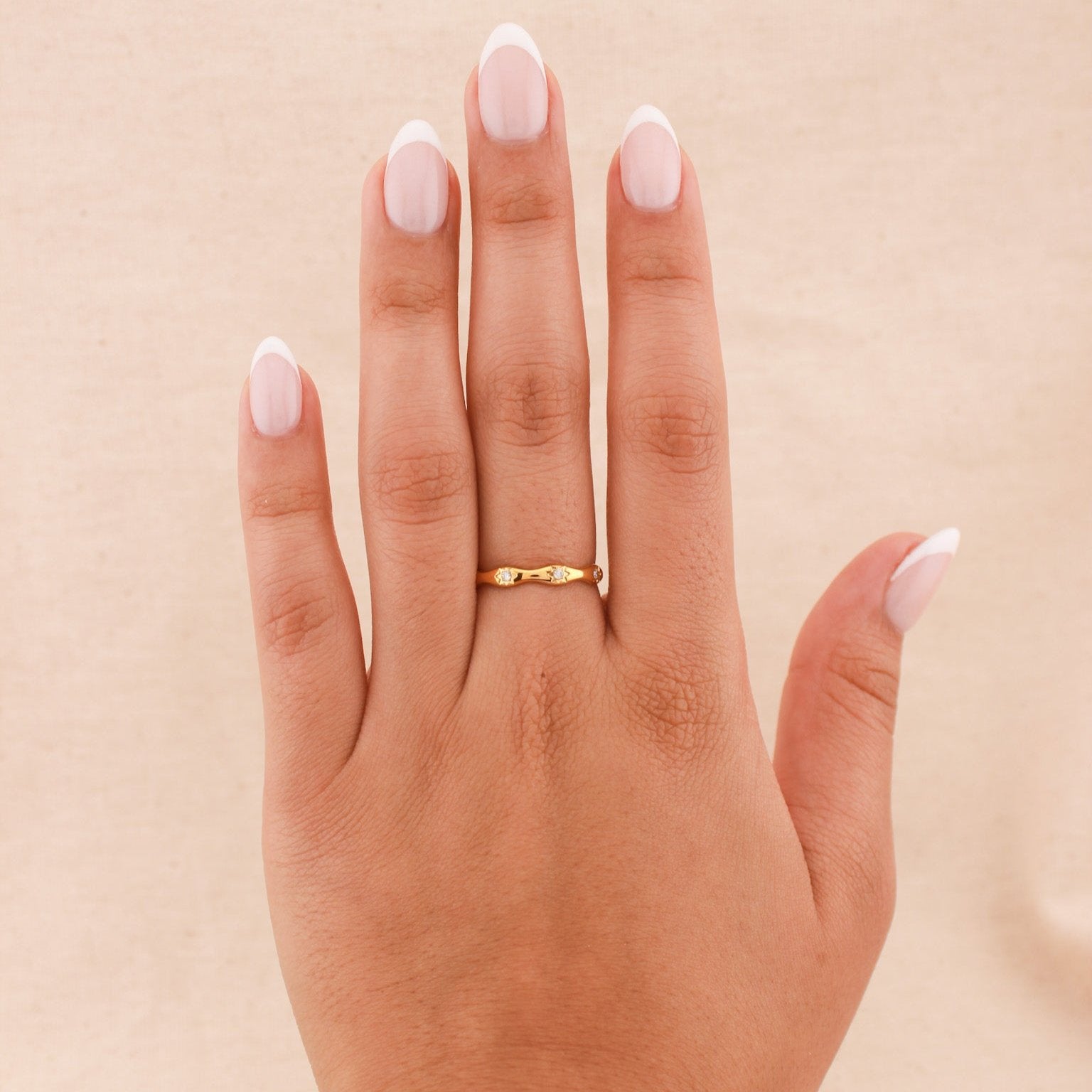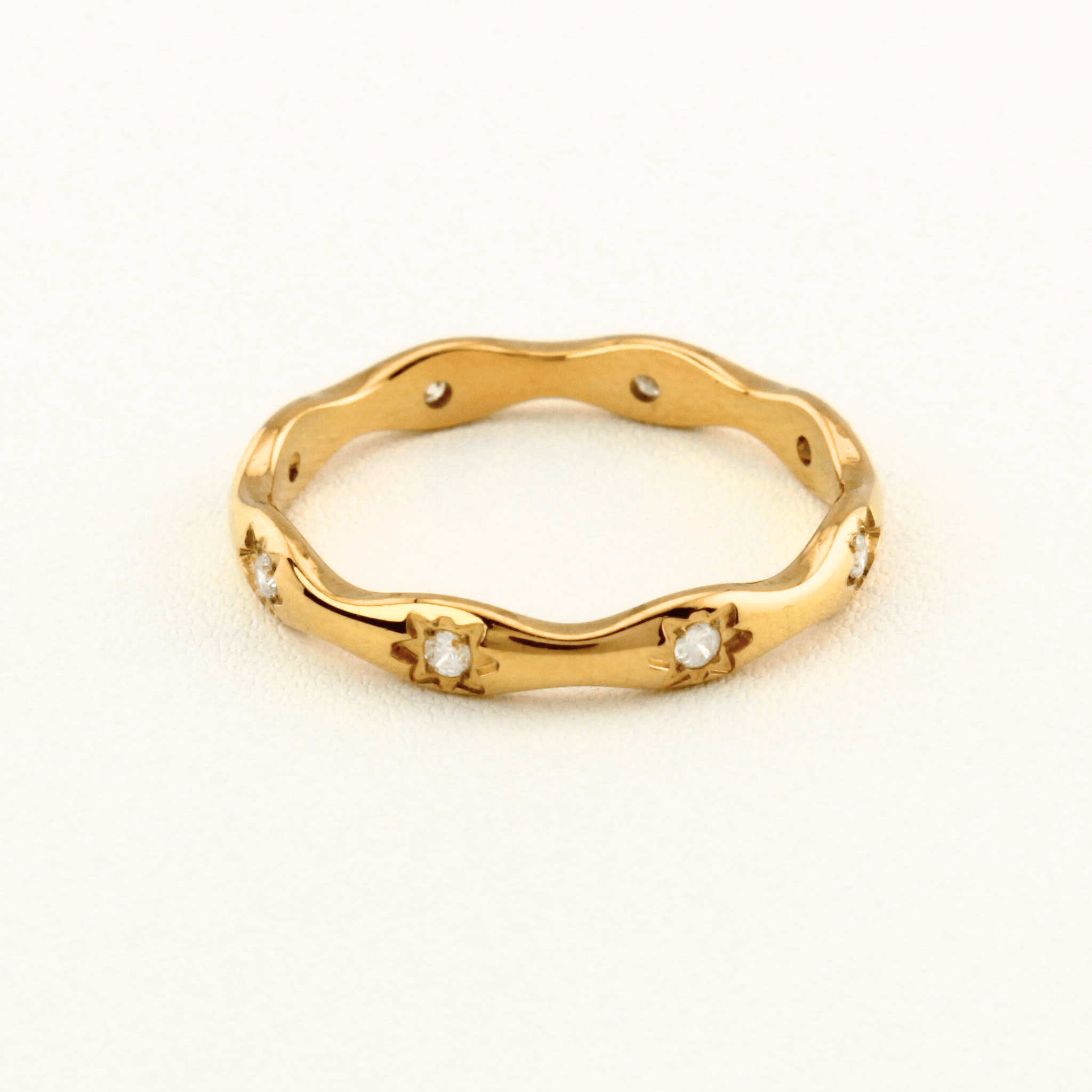 Add a touch of celestial charm to your jewelry collection with our Starry ring. Made from high-quality gold plated stainless steel, this ring has intricate cubic zirconia star designs on a dainty wavy band. Whether worn on its own or layered with our Heiress ring, this piece is simple for any look.
