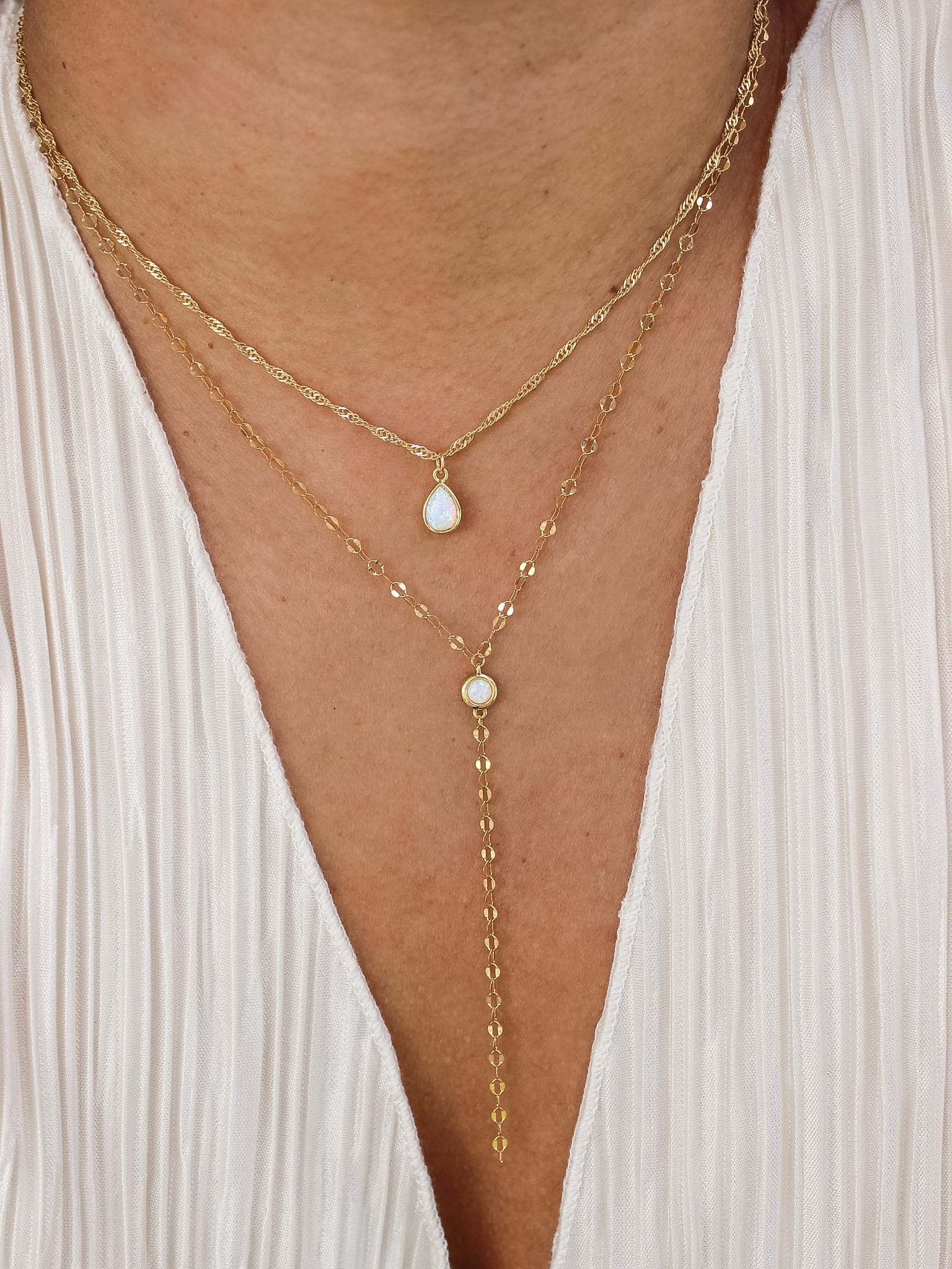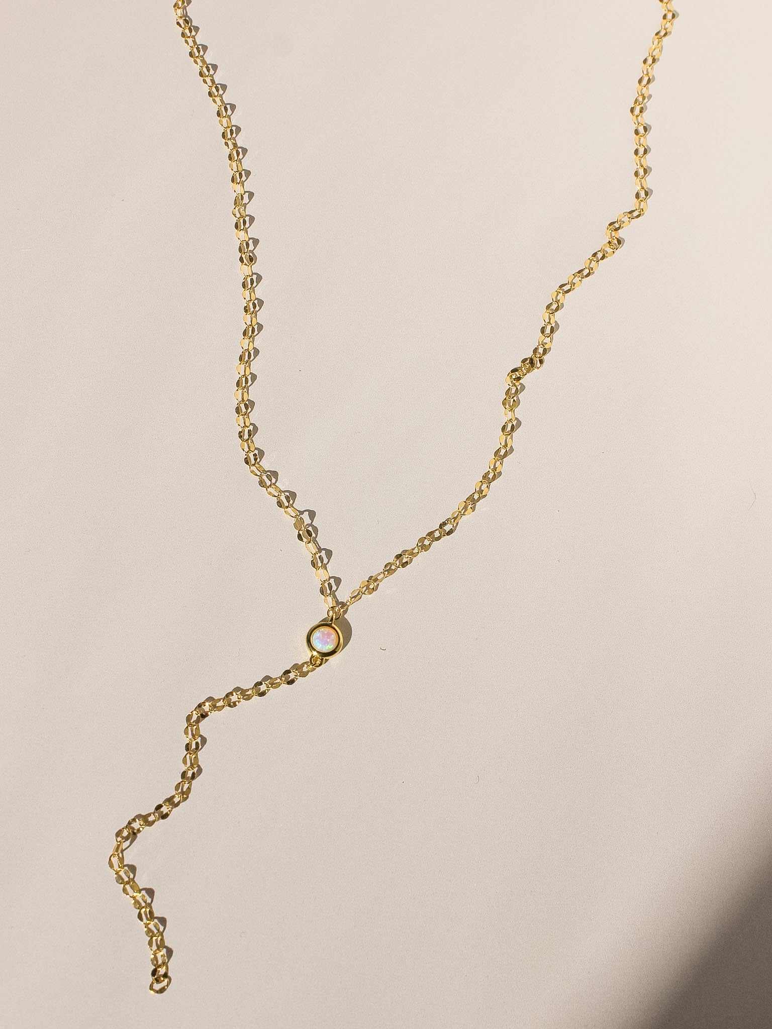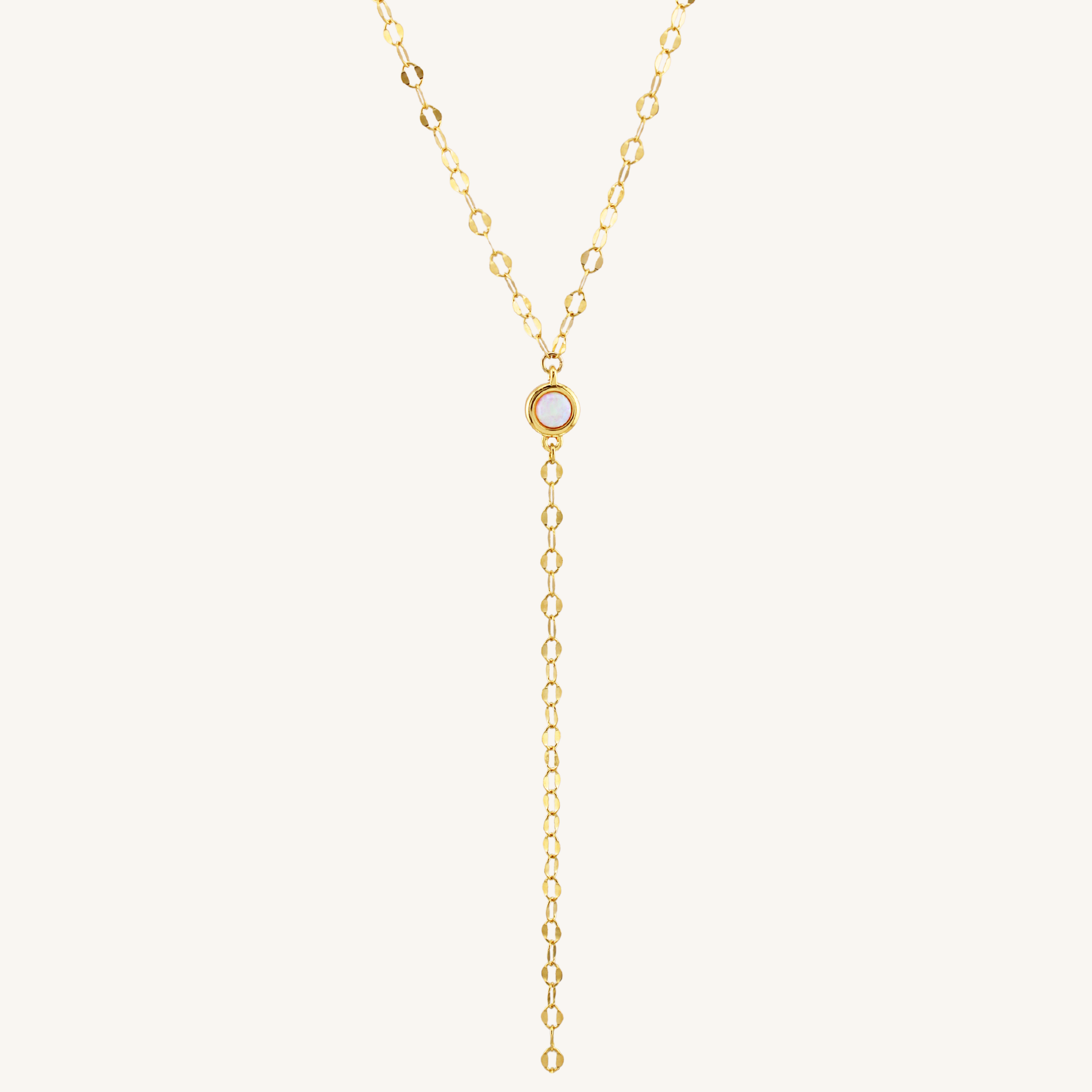 This lariat opalescent necklace features a small opal stone at the center with a delicate drop chain that creates a longer, flowing look. The design adds a little movement, making it feel more elevated than a simple everyday necklace. This style works especially well with open necklines and dresses, but it’s still easy enough to wear day to day.
