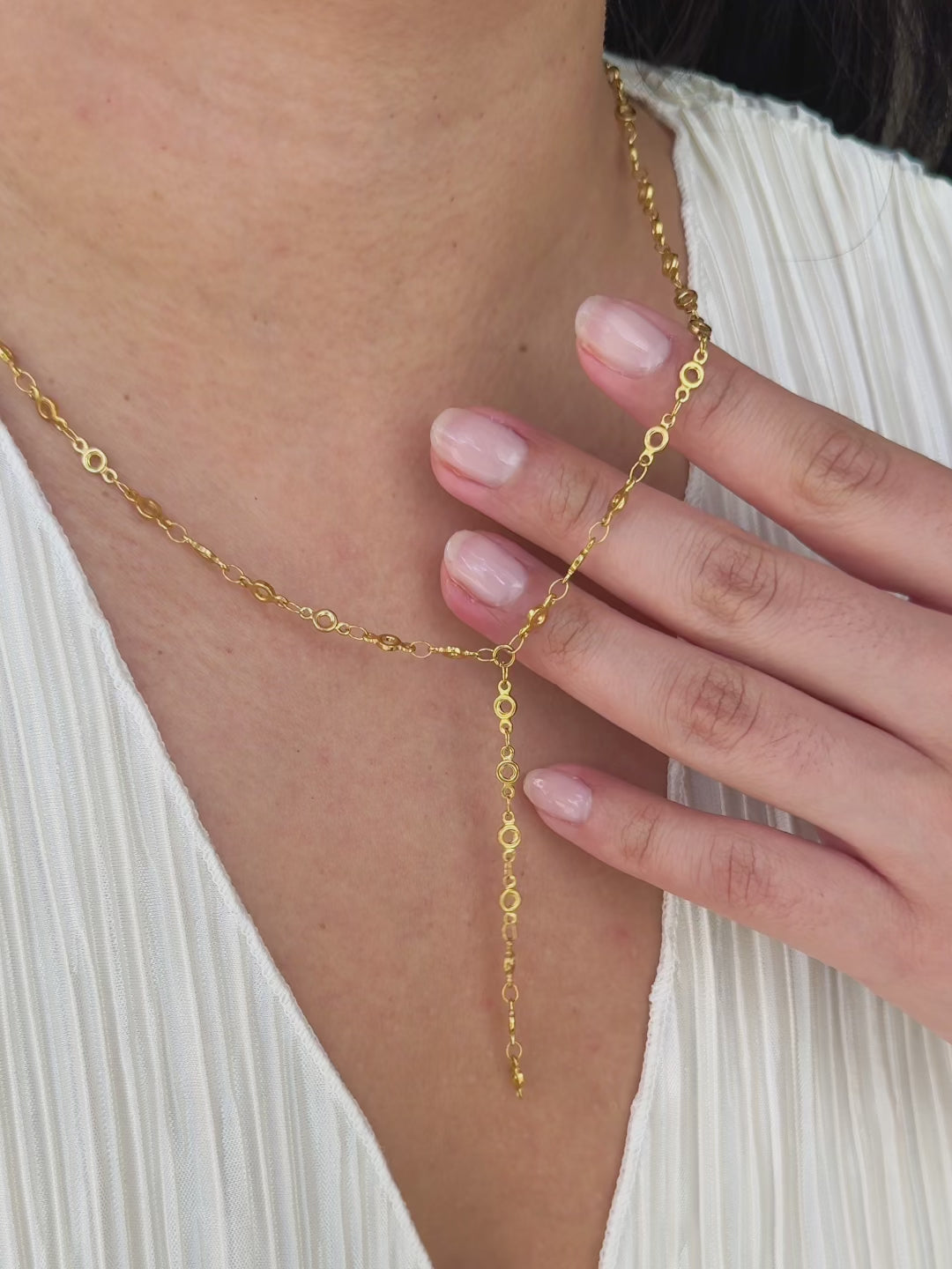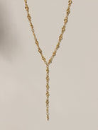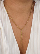 The Halo Lariat necklace features a chain with small circle links that give it a more modern, styled look. The drop detail adds length and movement, making it stand out more than a basic chain necklace. It works well when you want something simple but a little more interesting than a plain gold necklace. It pairs easily with both casual and dressed up looks and can be worn on its own as a statement or layered with other pieces.