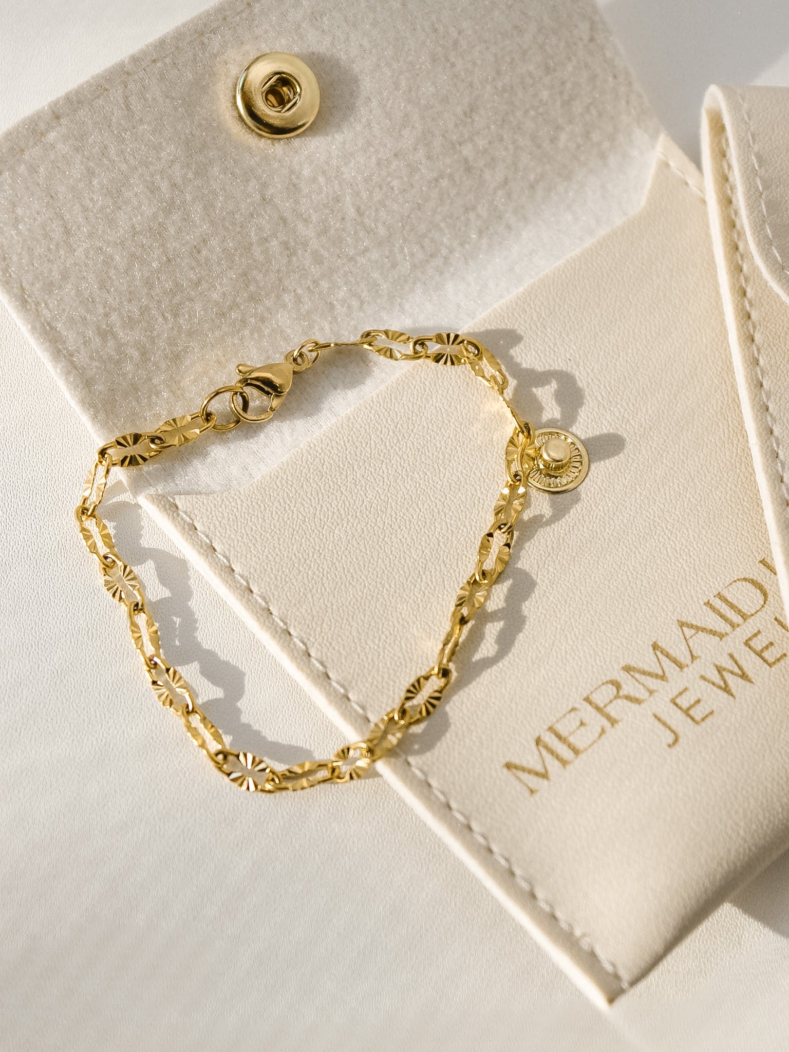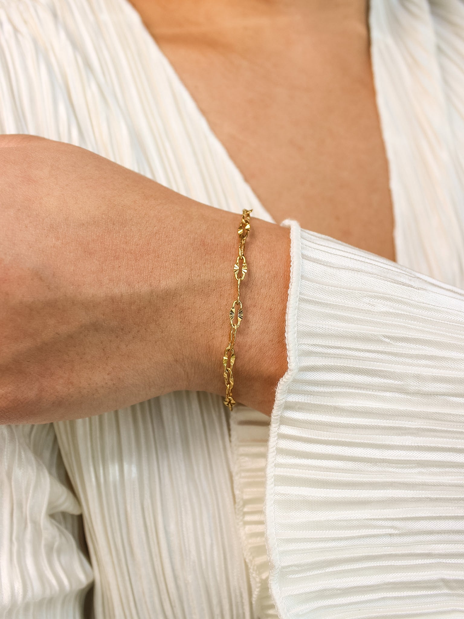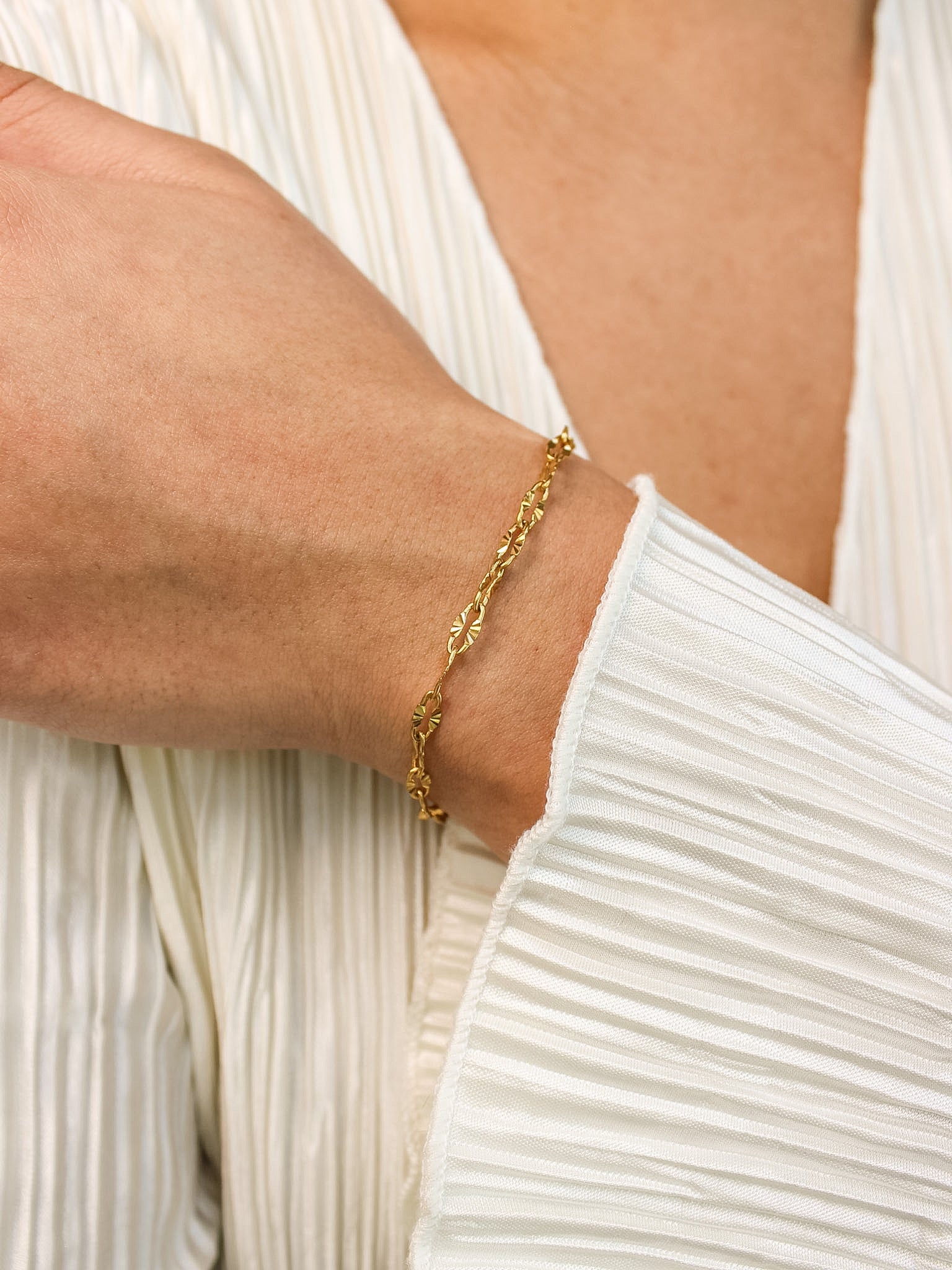This Link Up gold bracelet is an easy everyday piece you can wear with anything. It has a lip chain design with a little texture that catches the light without being too flashy. It’s made from stainless steel with PVD gold plating, so it won’t fade easily and you don’t have to worry about taking it off all the time. It’s water resistant and tarnish resistant, which makes it perfect for daily wear.