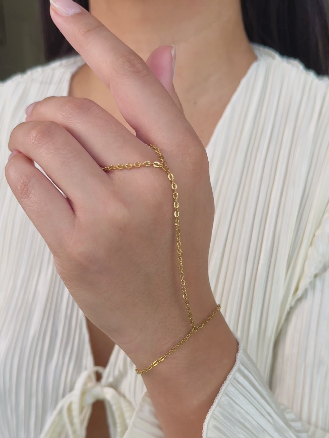 This sparkle cable hand chain is a simple piece with a delicate but sturdy sparkle chain that has a little extra shine. The cable chain design gives it a subtle sparkle that stands out just enough without feeling too much. It’s made from PVD gold plated stainless steel, so it’s durable, water safe, and made for everyday wear and regular use.