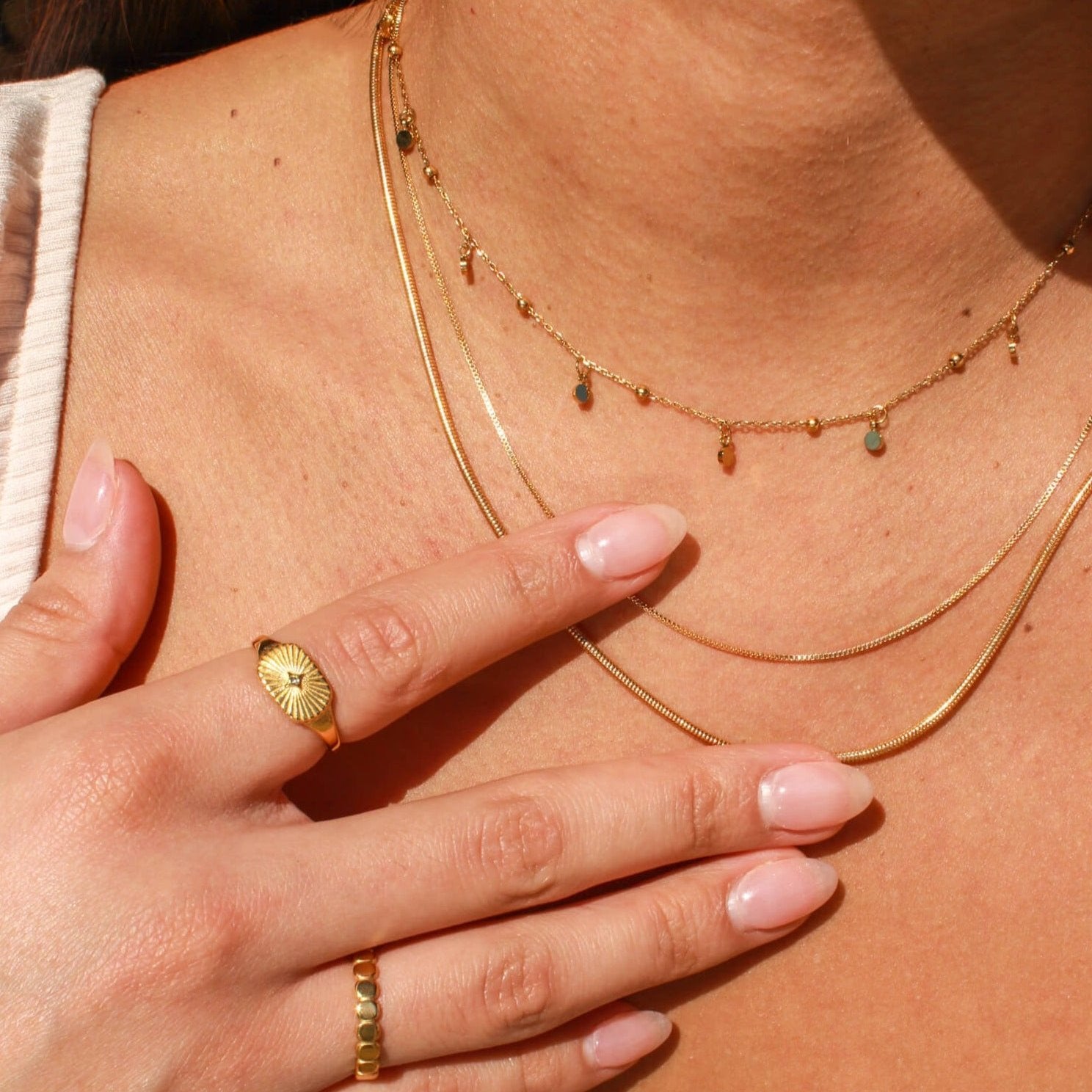 Our jewelry is made with a high-quality stainless steel base and finished with a special PVD coating process—giving each piece a thicker, more durable plating that’s water-safe and long-lasting.