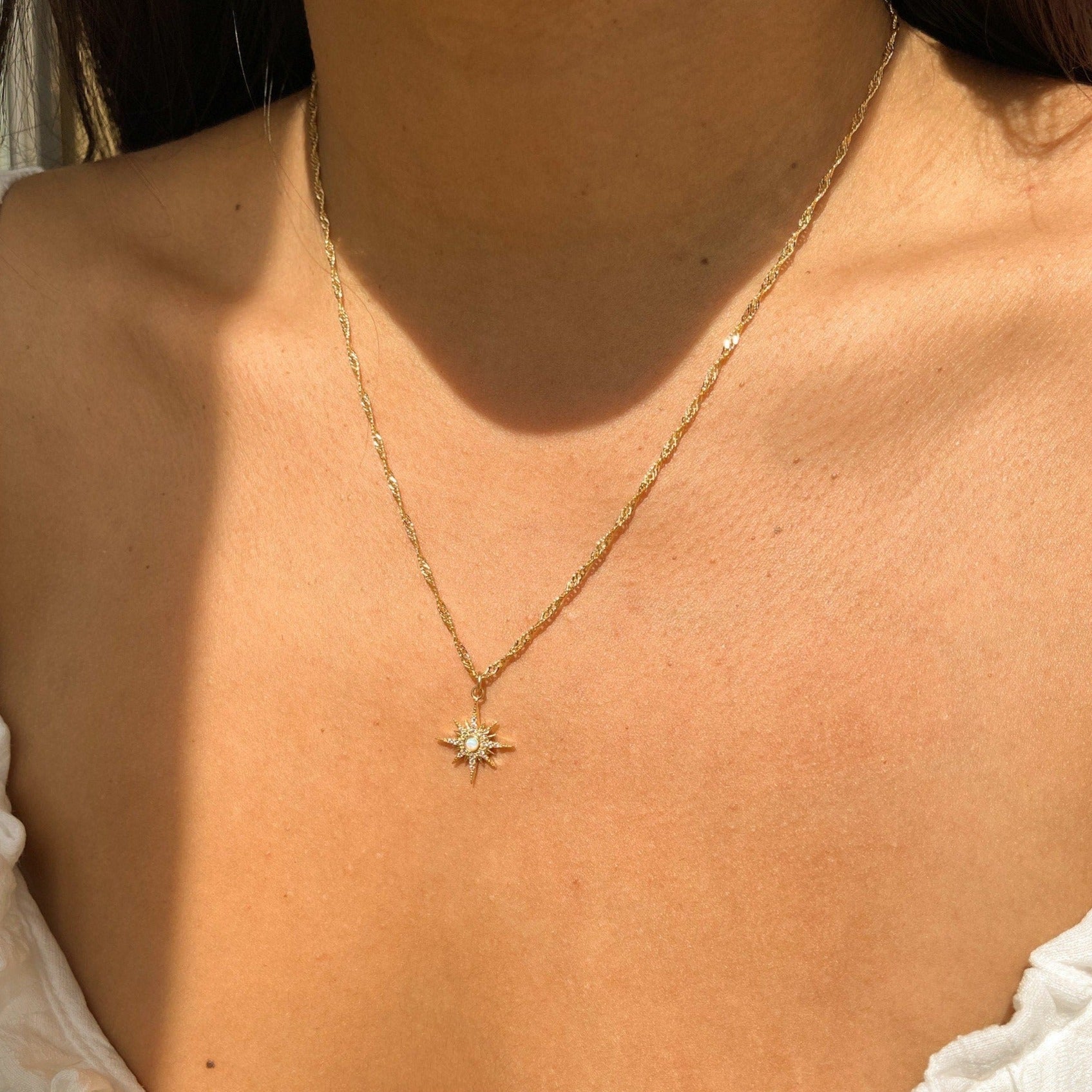 Featuring a beautiful glimmering opal star pendant, this dainty and minimalist necklace is made with gold filled metal that won’t tarnish. Each necklace comes with an extender to make adjustable to wear at different lengths.