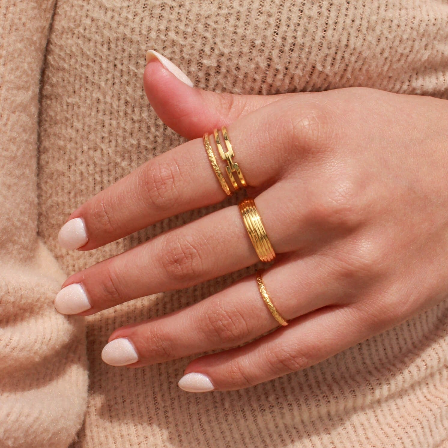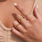 Embrace simplicity with our durable and dainty Marie ring. Built to withstand daily use, this ring is both waterproof and tarnish resistant. Its minimalist style is perfect for everyday wear, while also being suitable for ring stacking. With this gold band, enhance your ring collection and your daily ring stack.