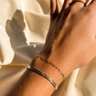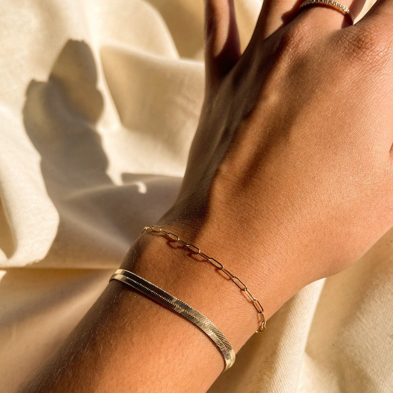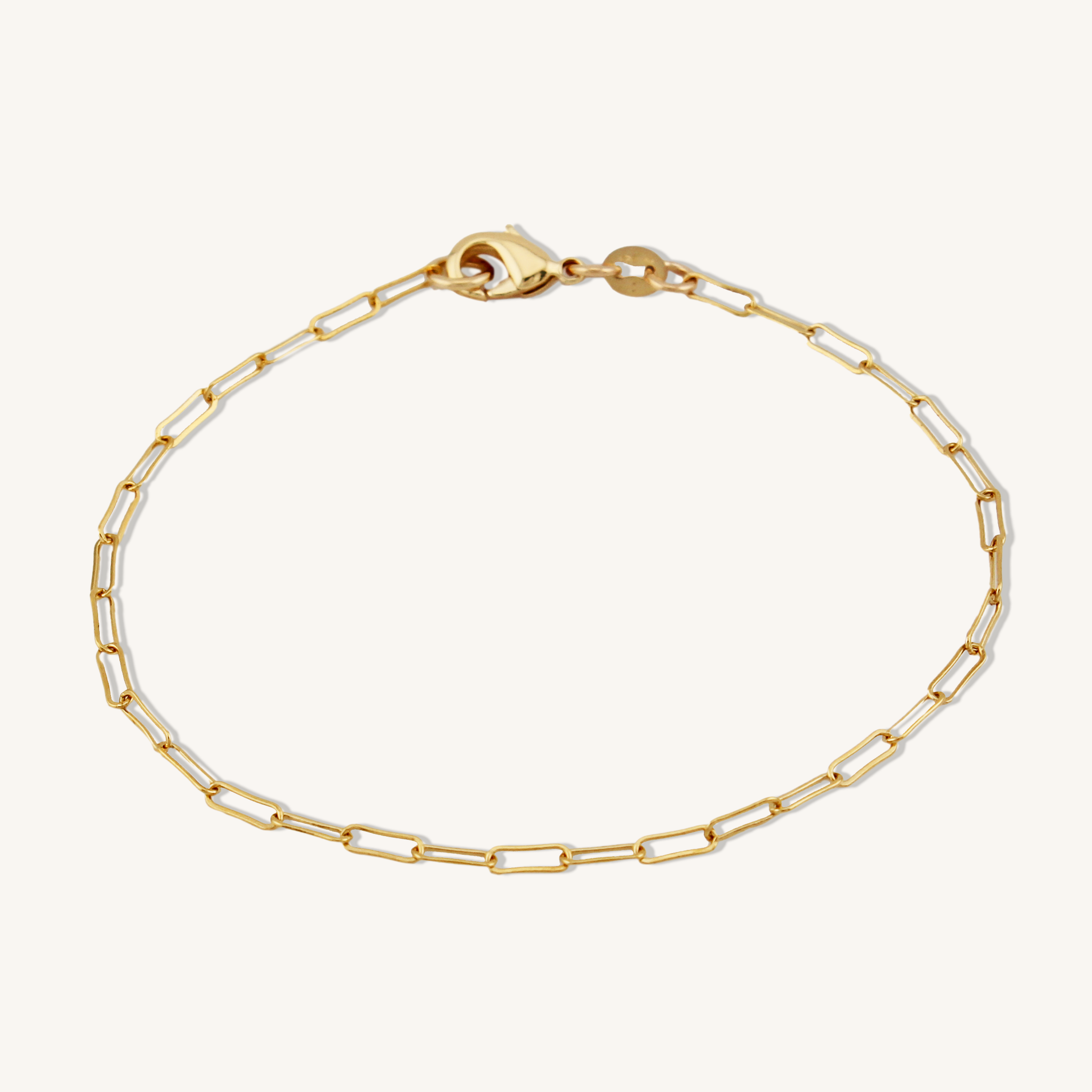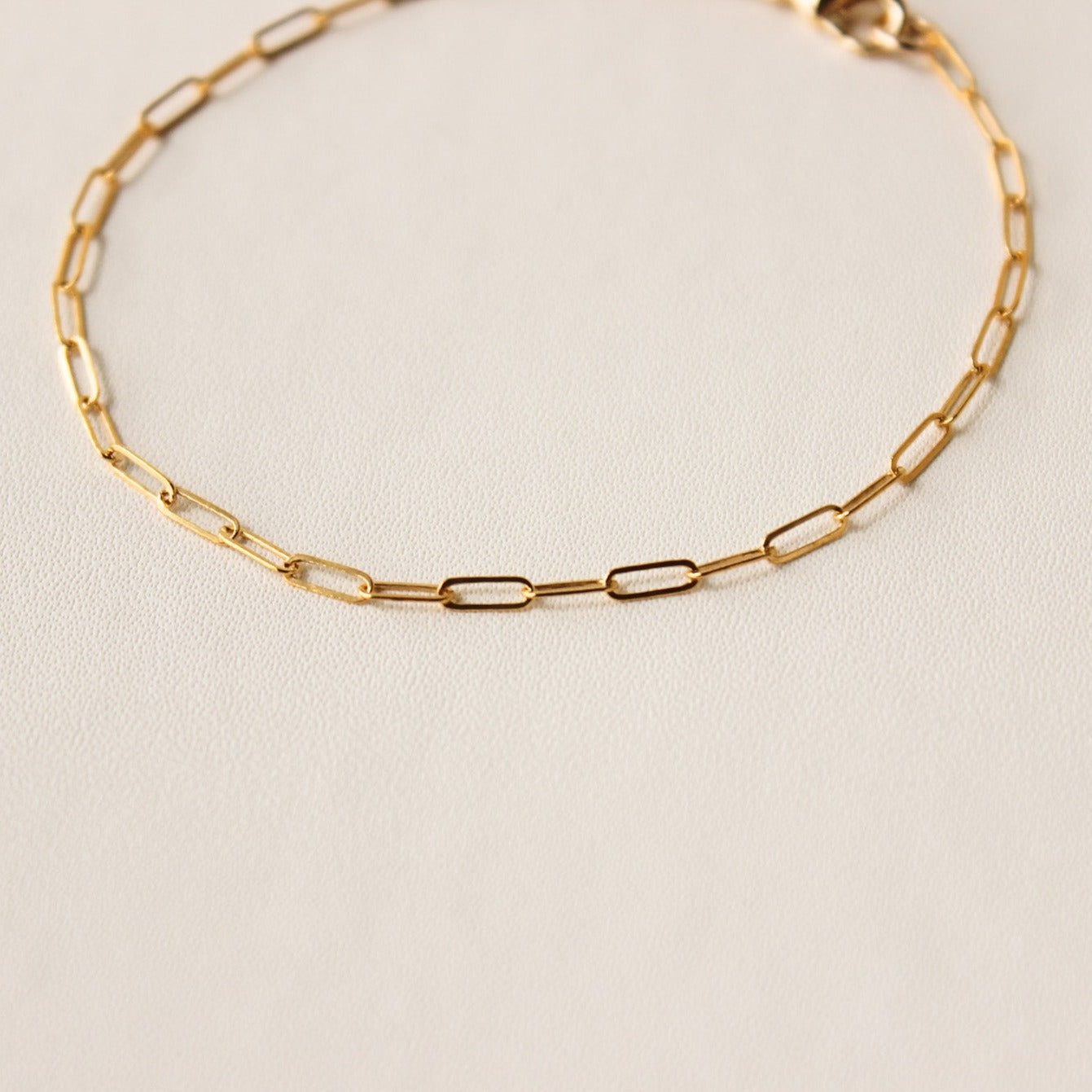 This gold filled mini paperclip-style bracelet is the perfect dainty accessory that won't tarnish over time. Its simple design captures a golden shine that will never fade.