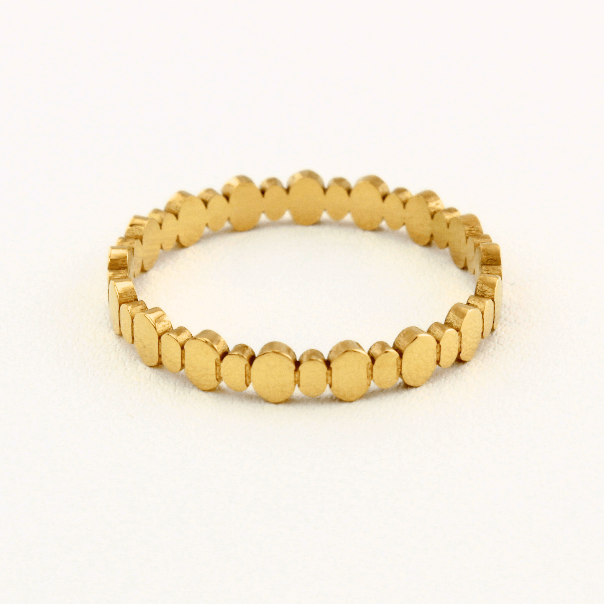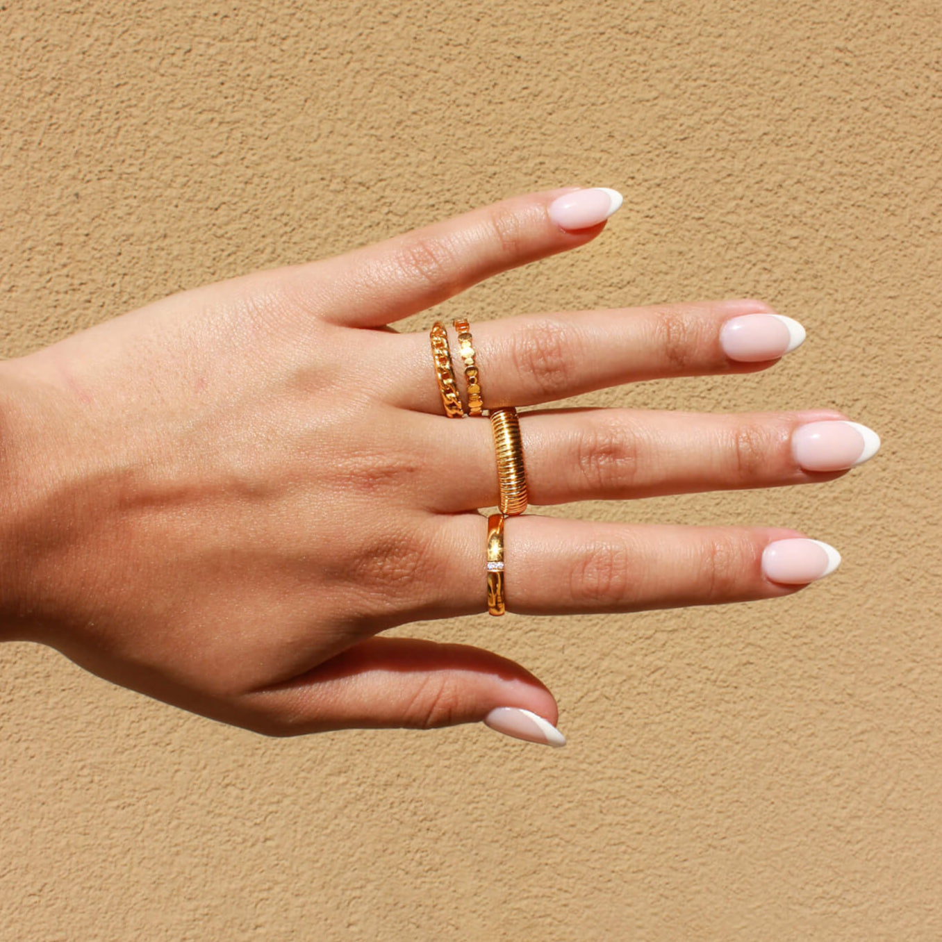 Get ready to elevate your ring stack with our Poppy ring! Made of gold plated stainless steel, this dainty ring features a hammered flat bead design that adds both texture and shine. It's also PVD plated for extra durability and water safety. Perfect for everyday wear and effortlessly stylish. Add it to your collection now!