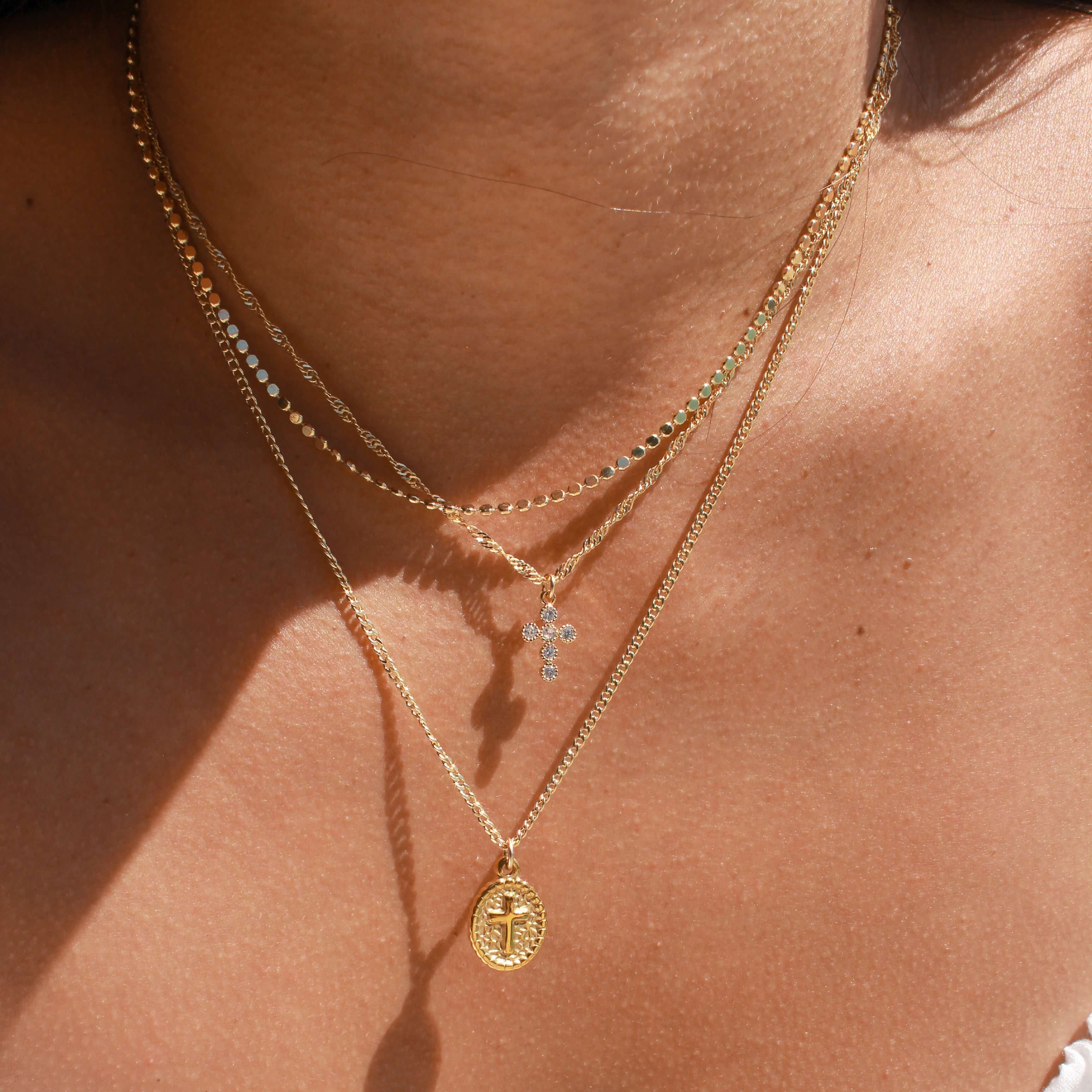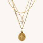 This necklace set includes three gold layered chains designed to be worn together. The set features our Rosalia cross charm necklace, our Eternal Faith coin cross pendant, and our Francesca gold disc chain.