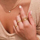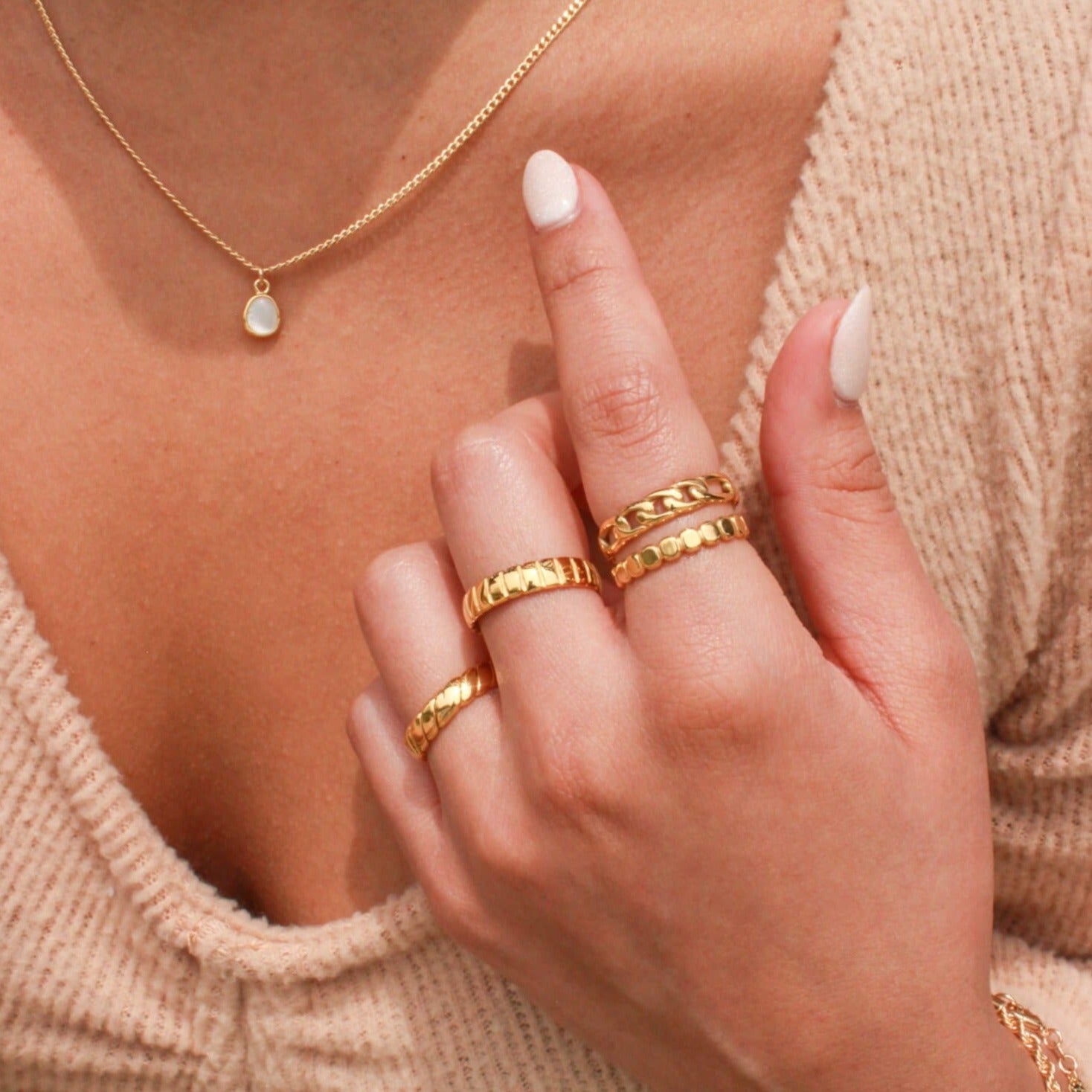 Check out our Freya ring, perfect for the everyday look or for your ring stack collection. It's Figaro link style can elevate any ring stack. Plus, no need to stress about it tarnishing cause it’s resistant to that and waterproof! All set on a durable stainless steel base.