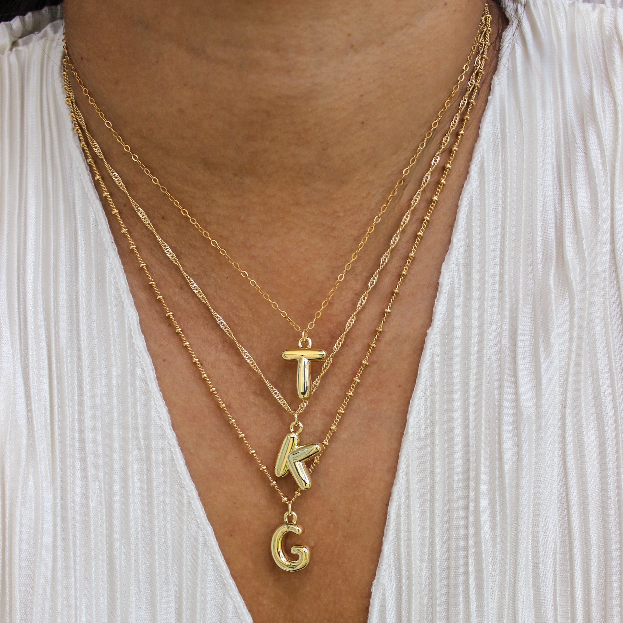 Level up your neck stack with our bubble letter charm necklace! This piece is super on-trend, featuring a puffy bubble initial charm that's perfect for your necklace stack. Choose your chain: go delicate with the bead, classic with the cable, or add some sparkle with the twist. Since it's gold filled, you don't have to stress about tarnishing!