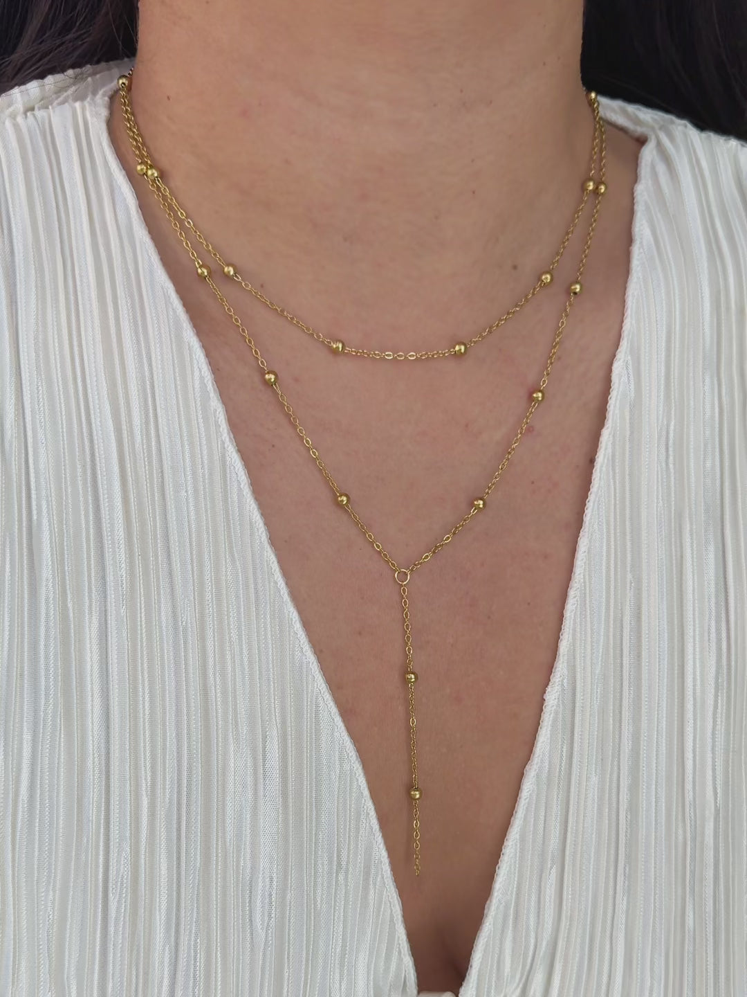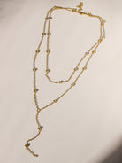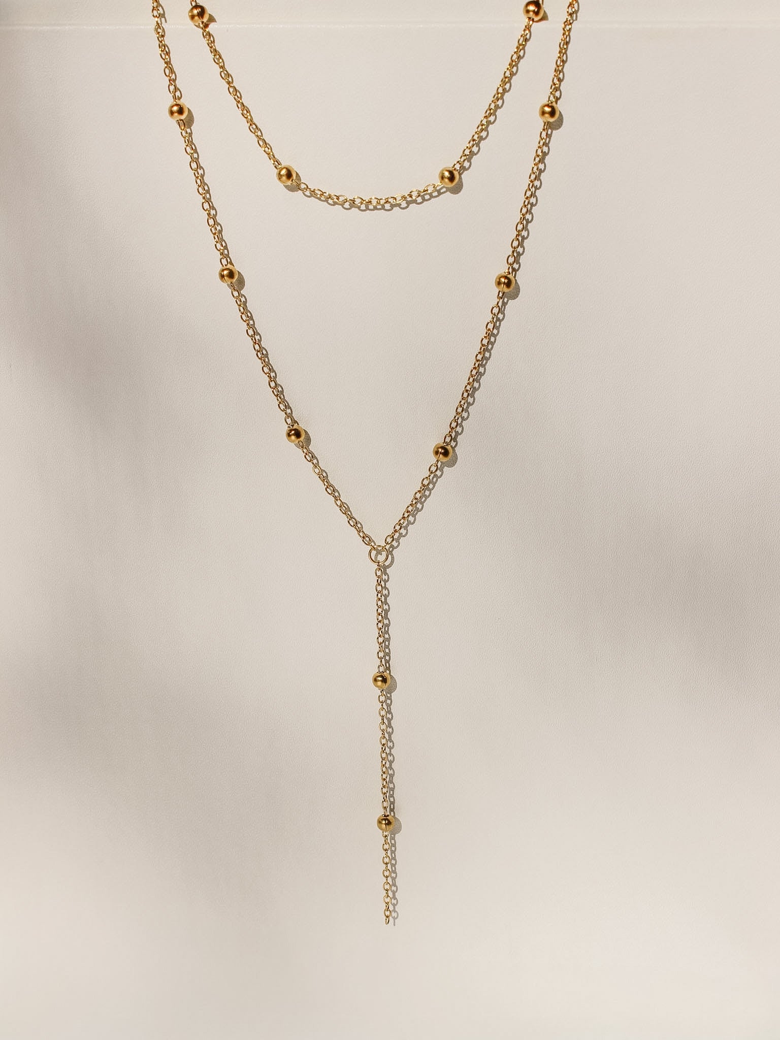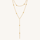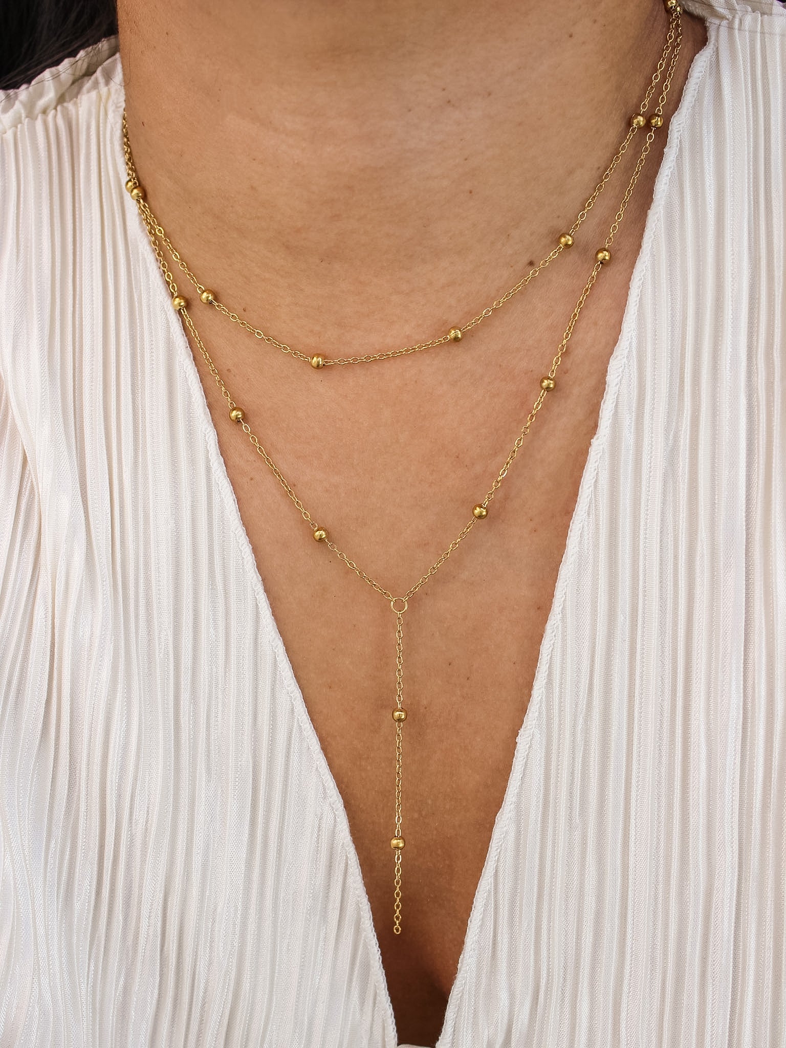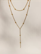 This gold beaded layered lariat necklace gives you a styled look in one piece. It features two connected layers with small gold beads spaced along the chain, plus a drop detail that adds length and movement.