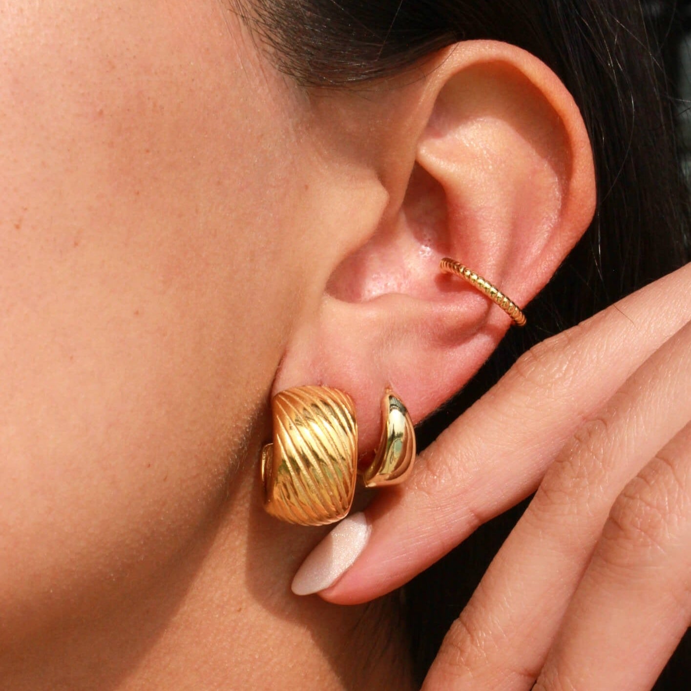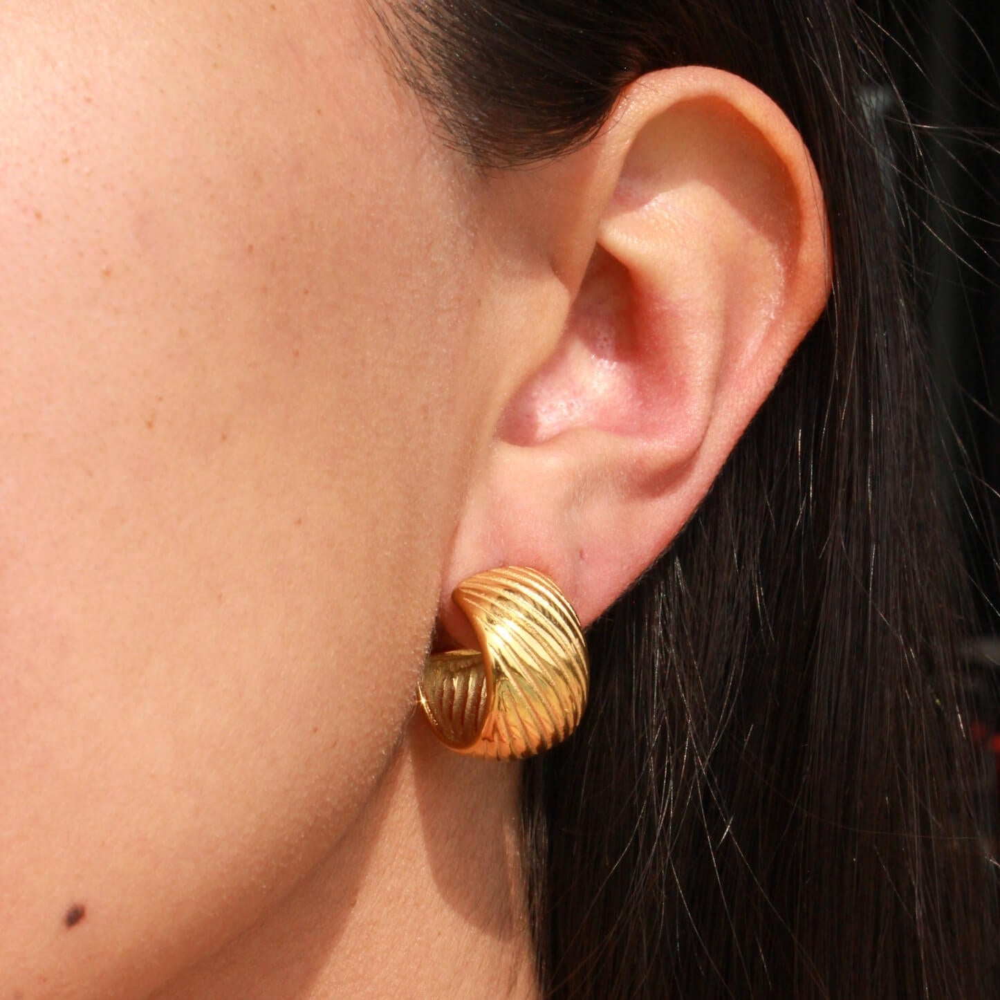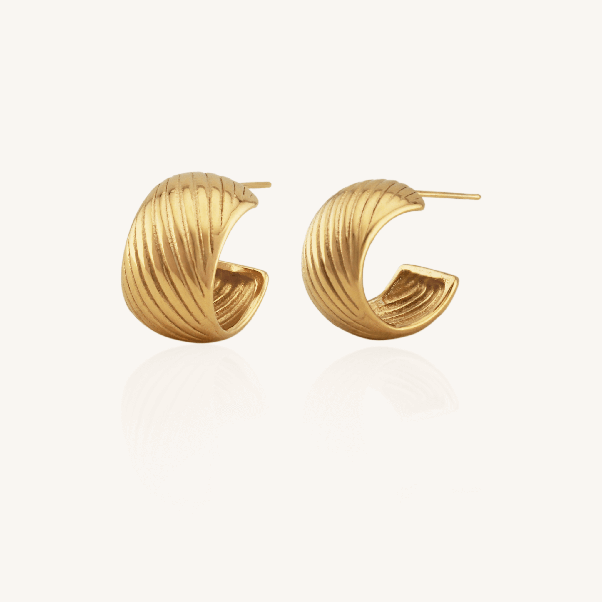 Make a statement with the Selena Hoops - the perfect chunky gold hoops for effortless everyday style. These chunky hoops feature a minimal textured design. They are easy to slip on and comfortably wear with the post and push back earring style. The pvd coating will ensure your hoops stay shiny, tarnish-resistant, and waterproof!
