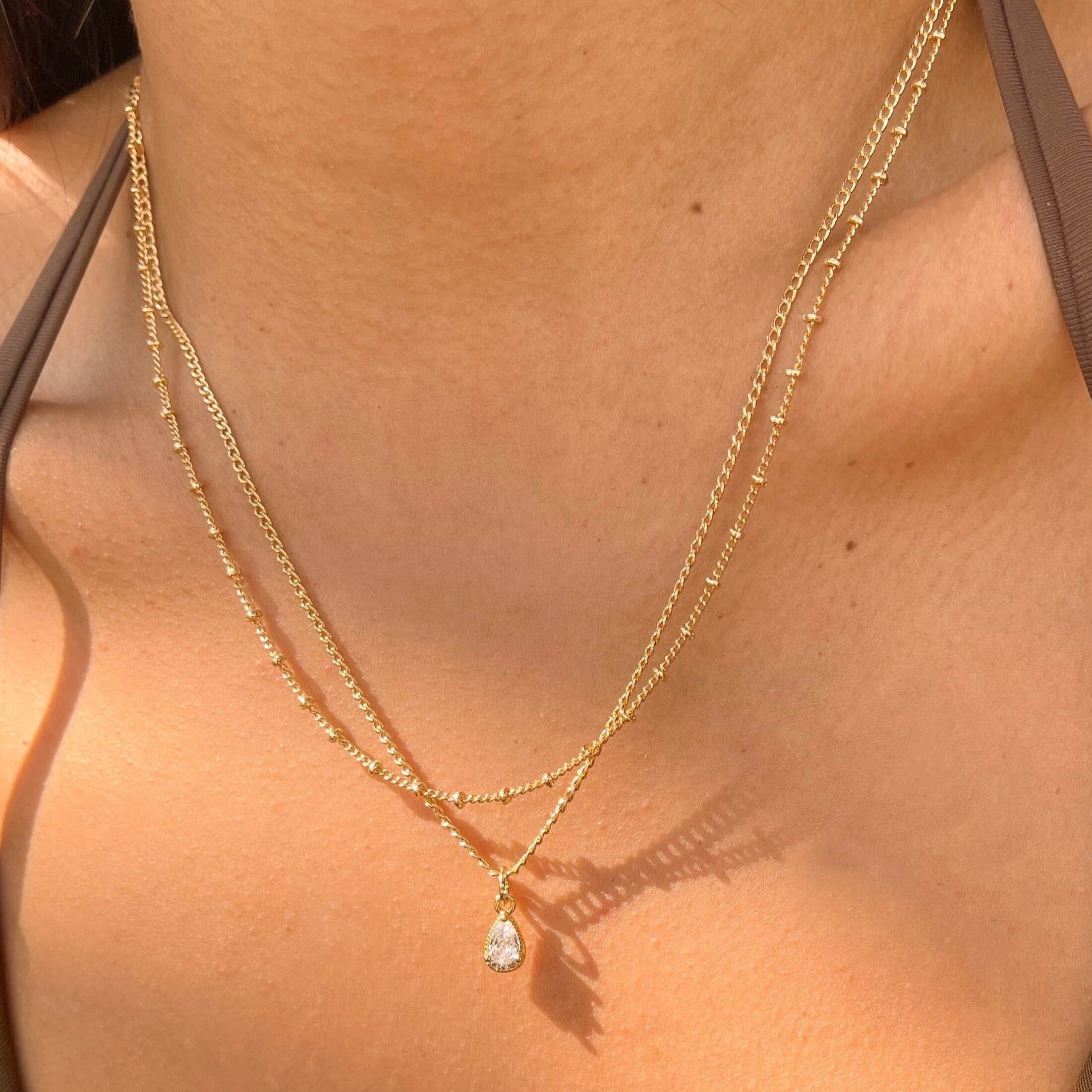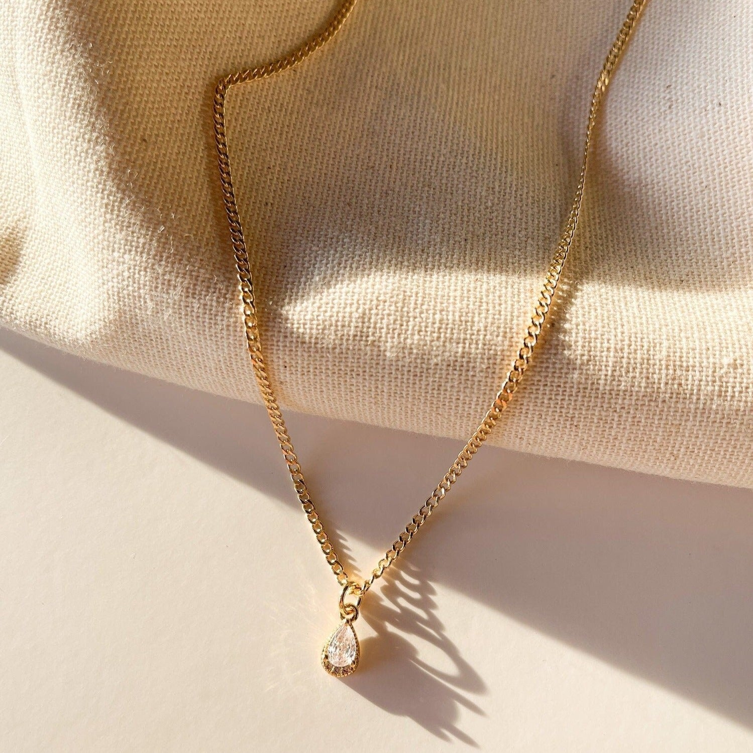 Our Aliyah necklace is simple yet elegant! This piece was crafted from high-quality gold filled material, making it the perfect choice for a wedding, as well as for day-to-day wear. The necklace includes a delicate Cubic Zirconia teardrop, suspended from a Cuban curb chain. An ideal choice for any bridal look, or for adding a touch of sophistication to your everyday jewelry.